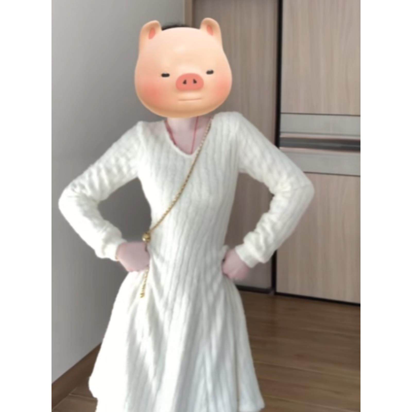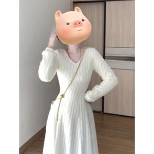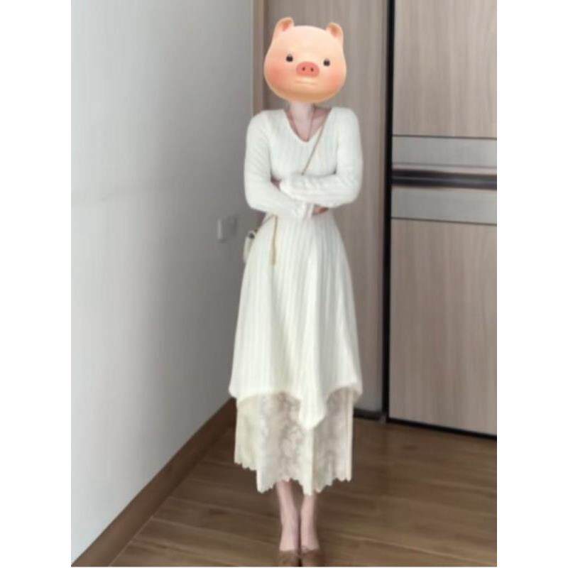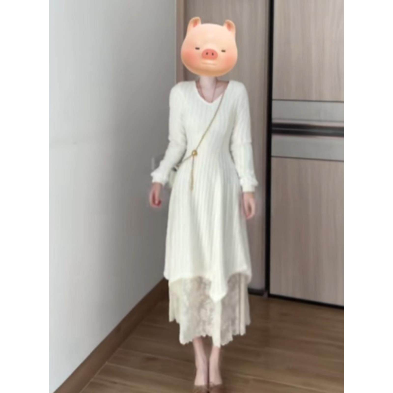高级感气质蕾丝拼接白色针织连衣裙女秋冬配大衣内搭打底毛衣长裙