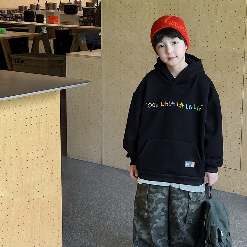儿童加绒保暖连帽上衣彩色字母刺绣男宝冬装 男童卫衣2025冬季 新款