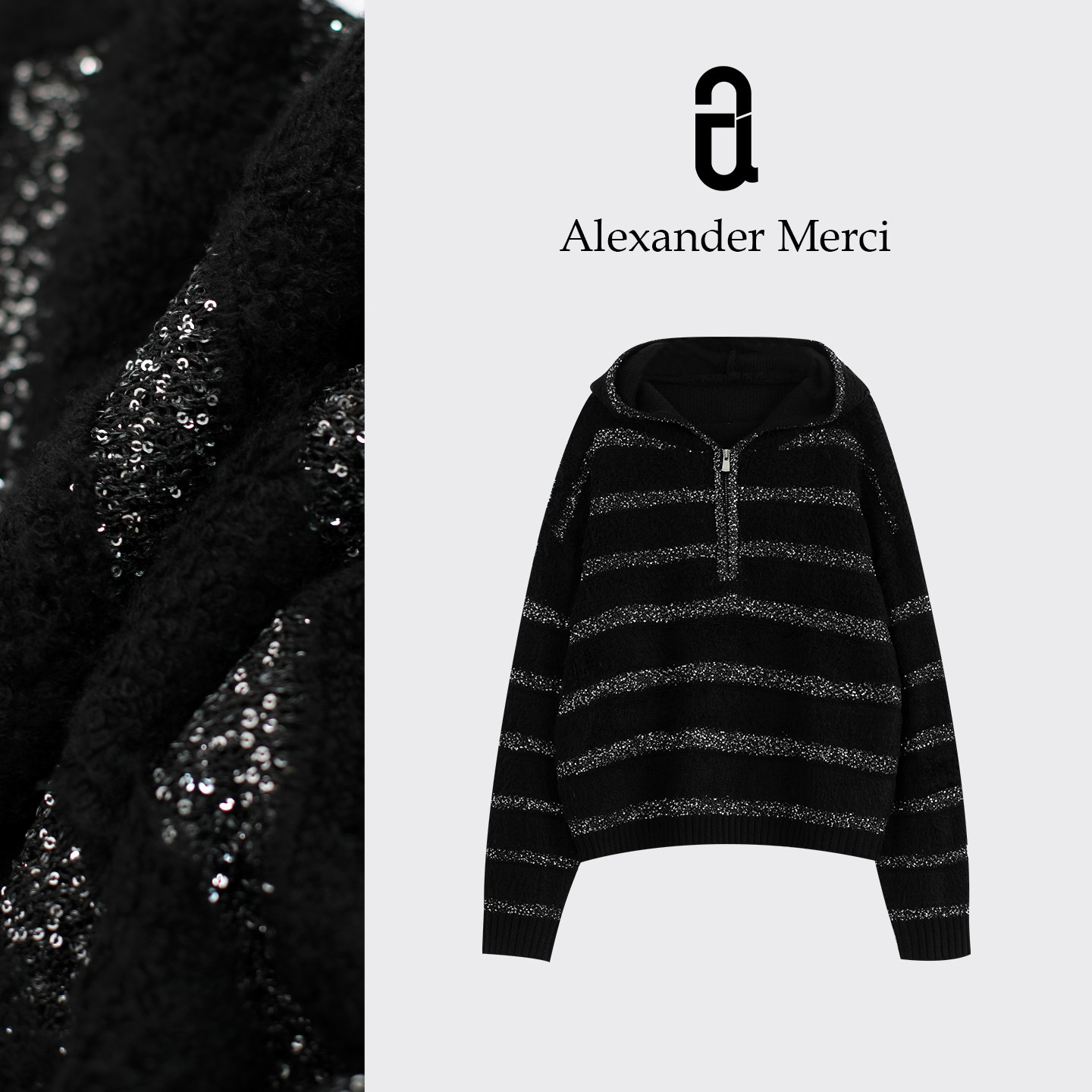 D25T10318 羊毛混纺亮片超暖和前拉链帽衫 许你耀眼