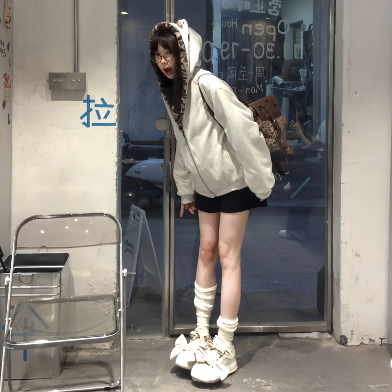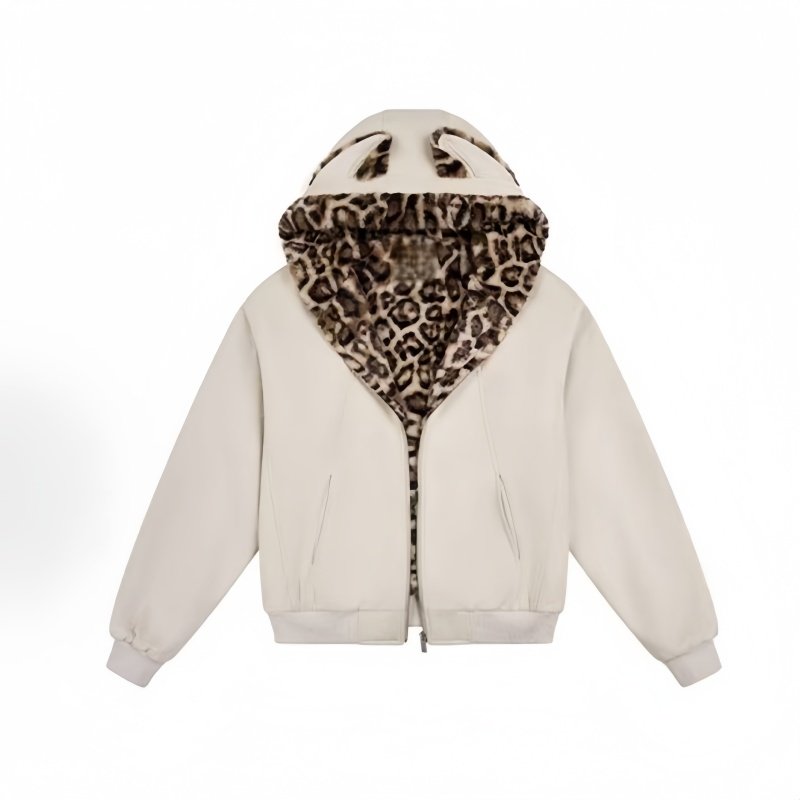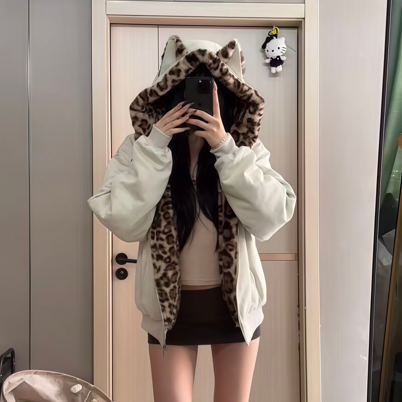 复古猫耳豹纹棉服女短款 美式 宽松保暖学生棉衣外套潮 新款 2025冬季