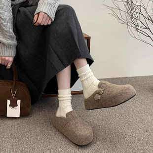 灰色毛呢复古内增高5cm勃肯鞋 女厚底小土豆加绒保暖包头毛毛拖鞋