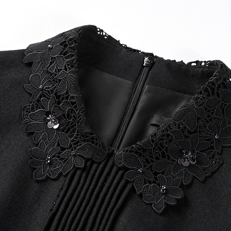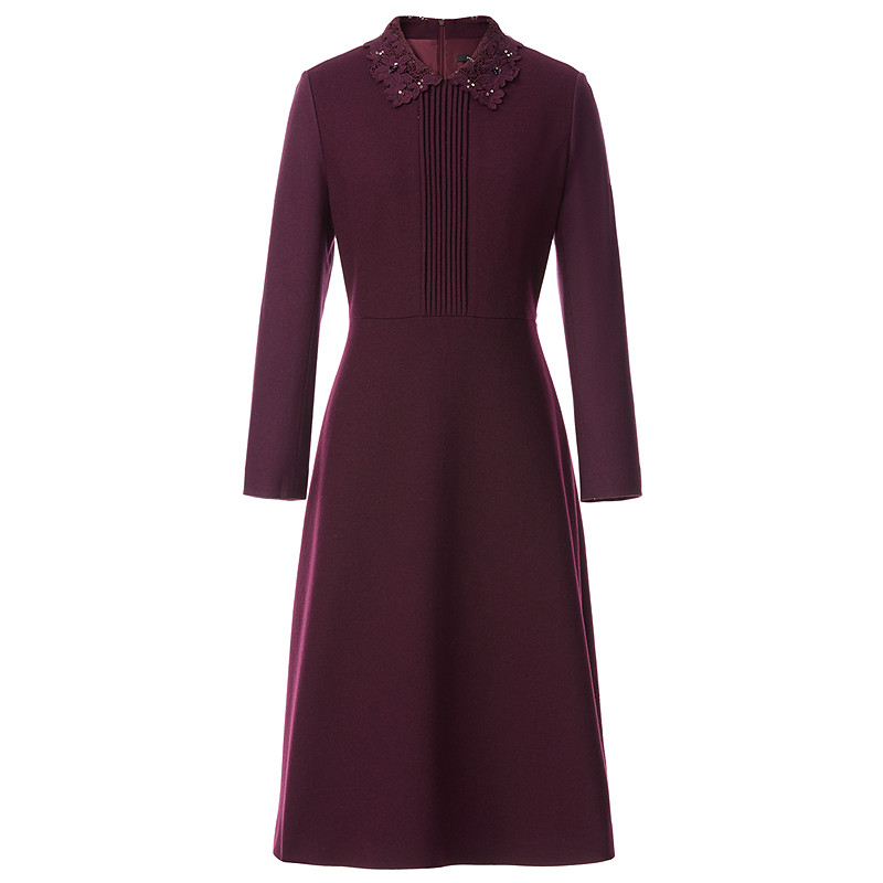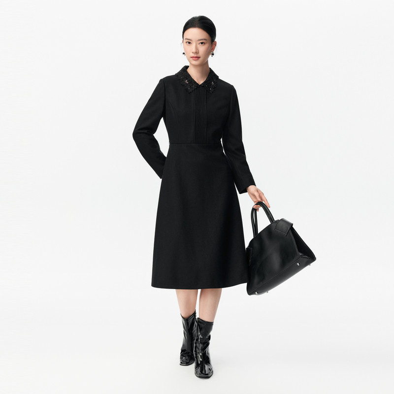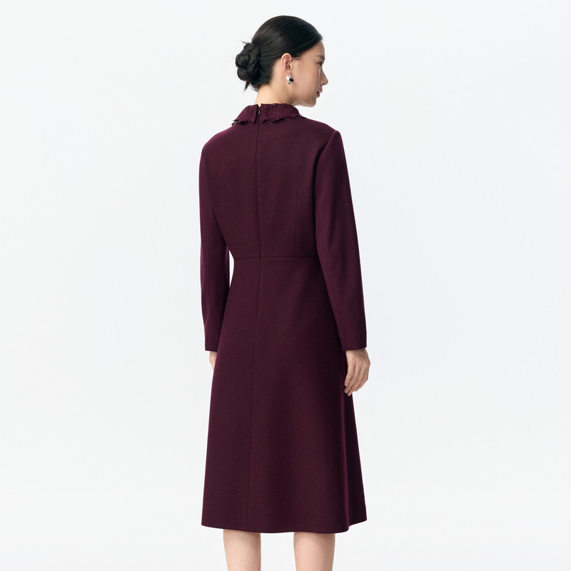 NAERSI娜尔思羊毛混纺连衣裙蕾丝花边翻领2026年春季 新款