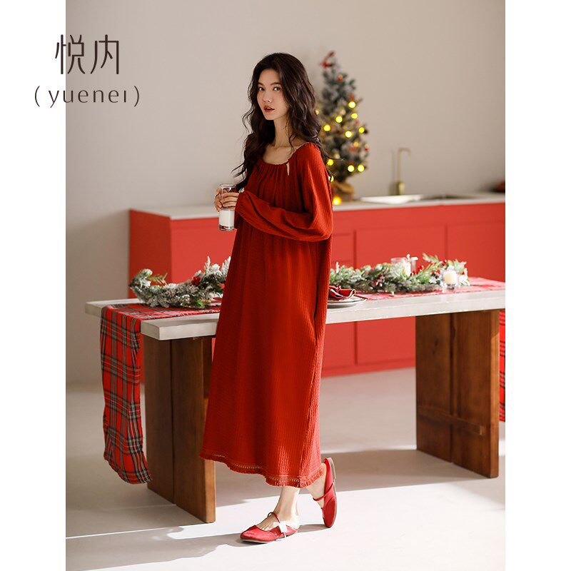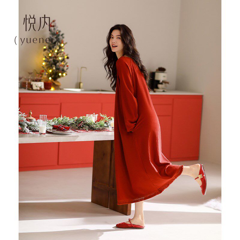 流苏长款 纯棉大码 红色本命年蛇年新年 长袖 悦内睡裙女士睡衣春秋款