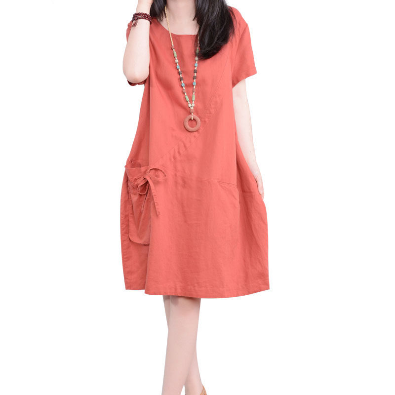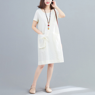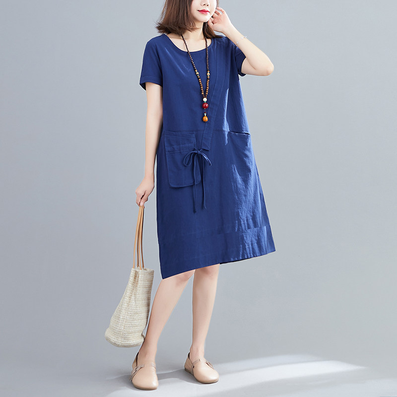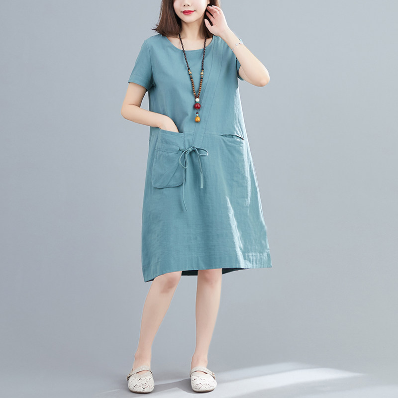 新款 亚麻短袖 韩版 棉麻连衣裙胖mm宽松中长款 女裙子 大码 2020夏季