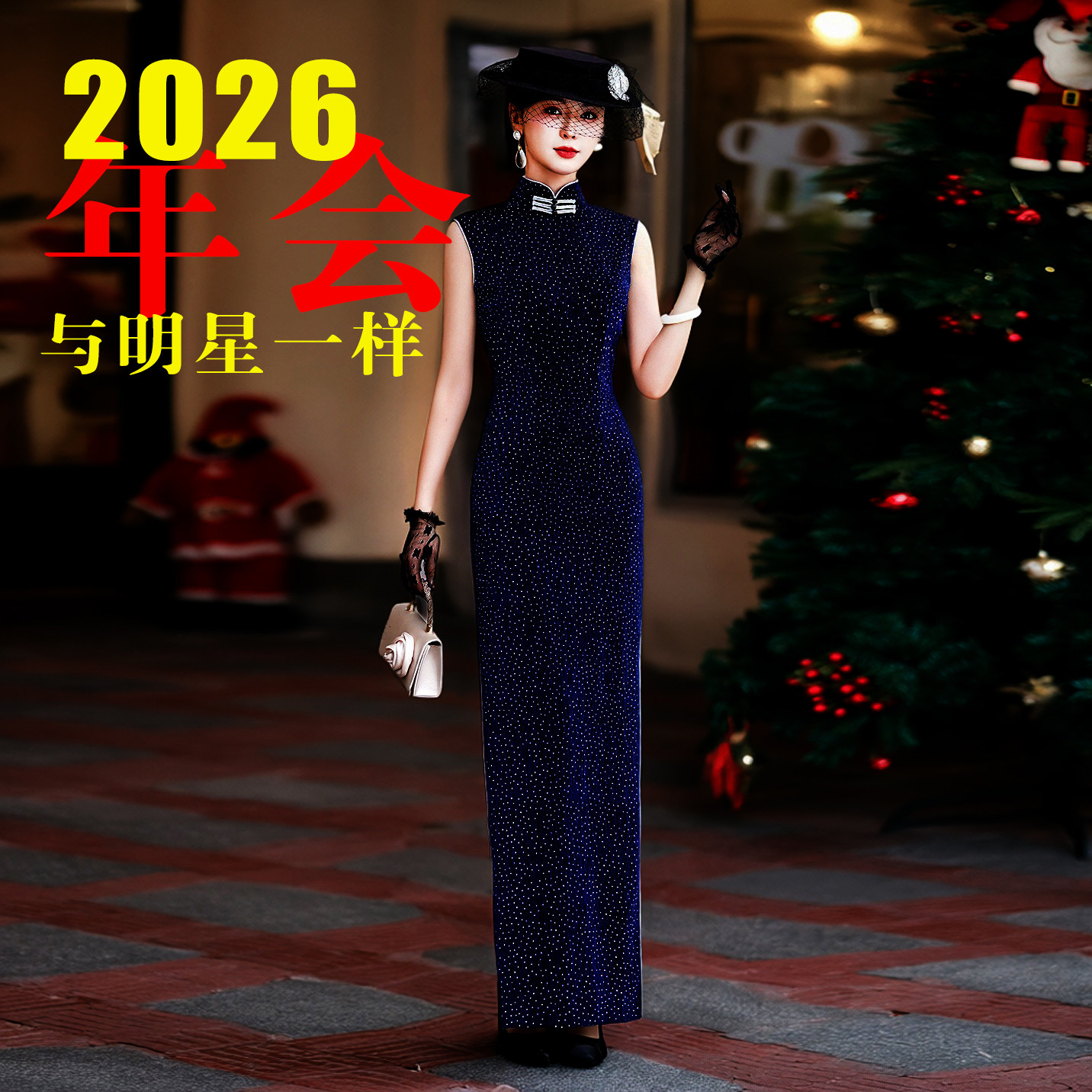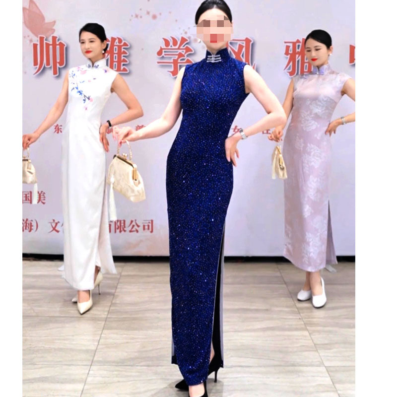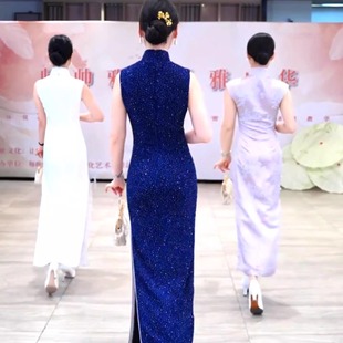 团队走秀2025新款 新中式 烫钻改良旗袍女高级感气质优雅长款 明星款