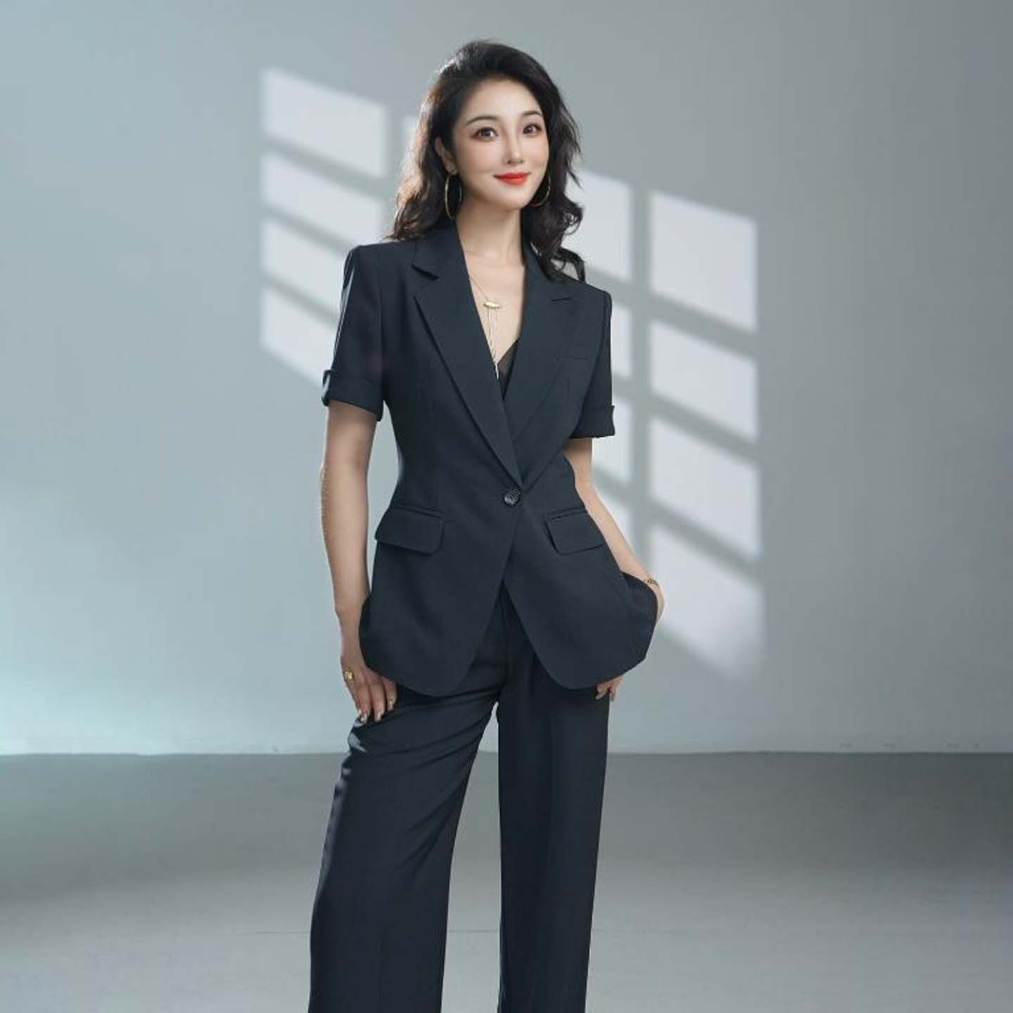 两件套小个子高级气质职业装 芝美日禾 女裤 套装 午夜蓝双排扣西装