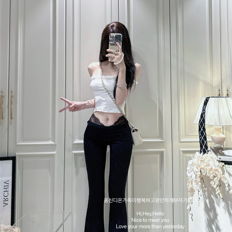 上衣蕾丝拼接高腰显瘦微喇喇叭长裤 褶皱一字修身 芭蕾练习室
