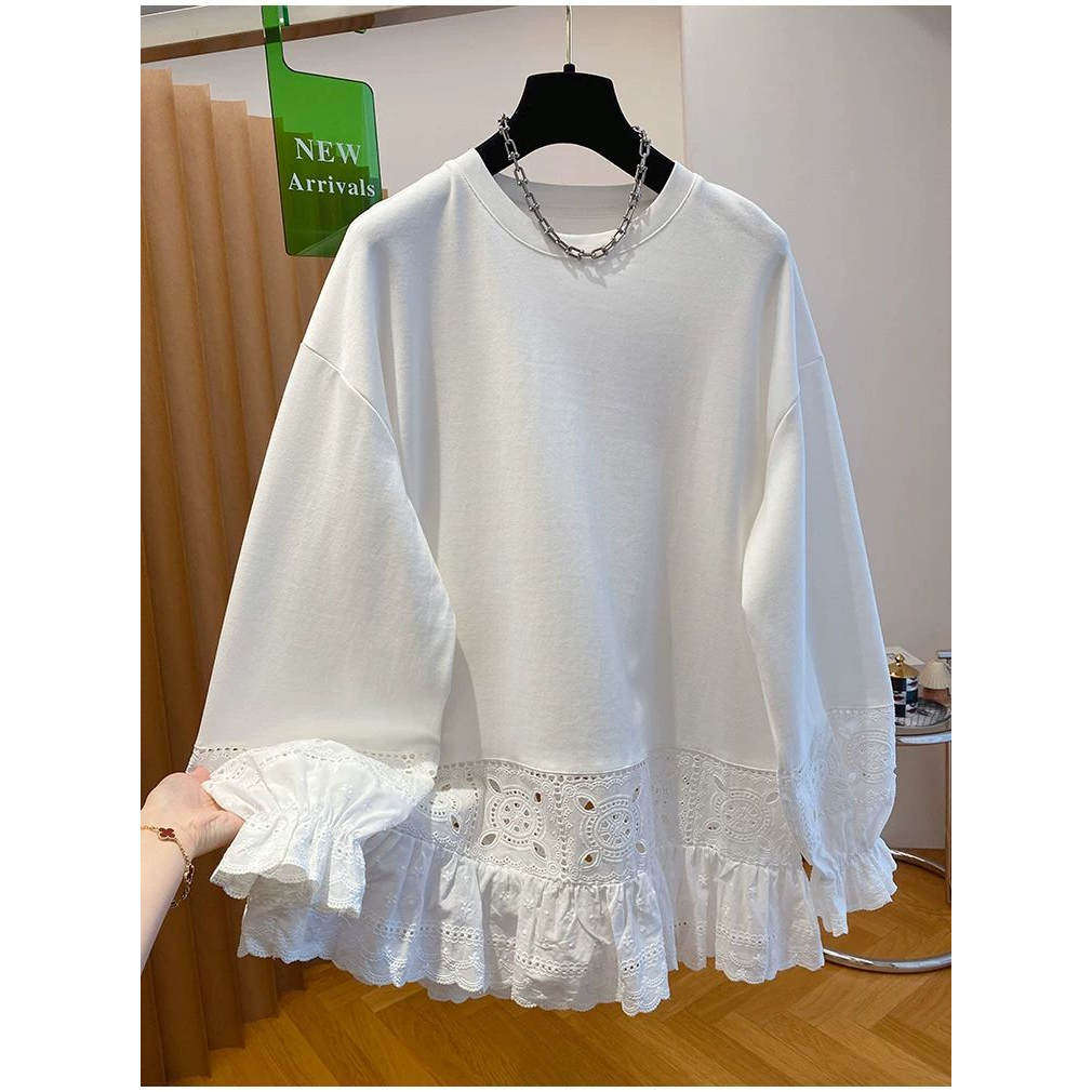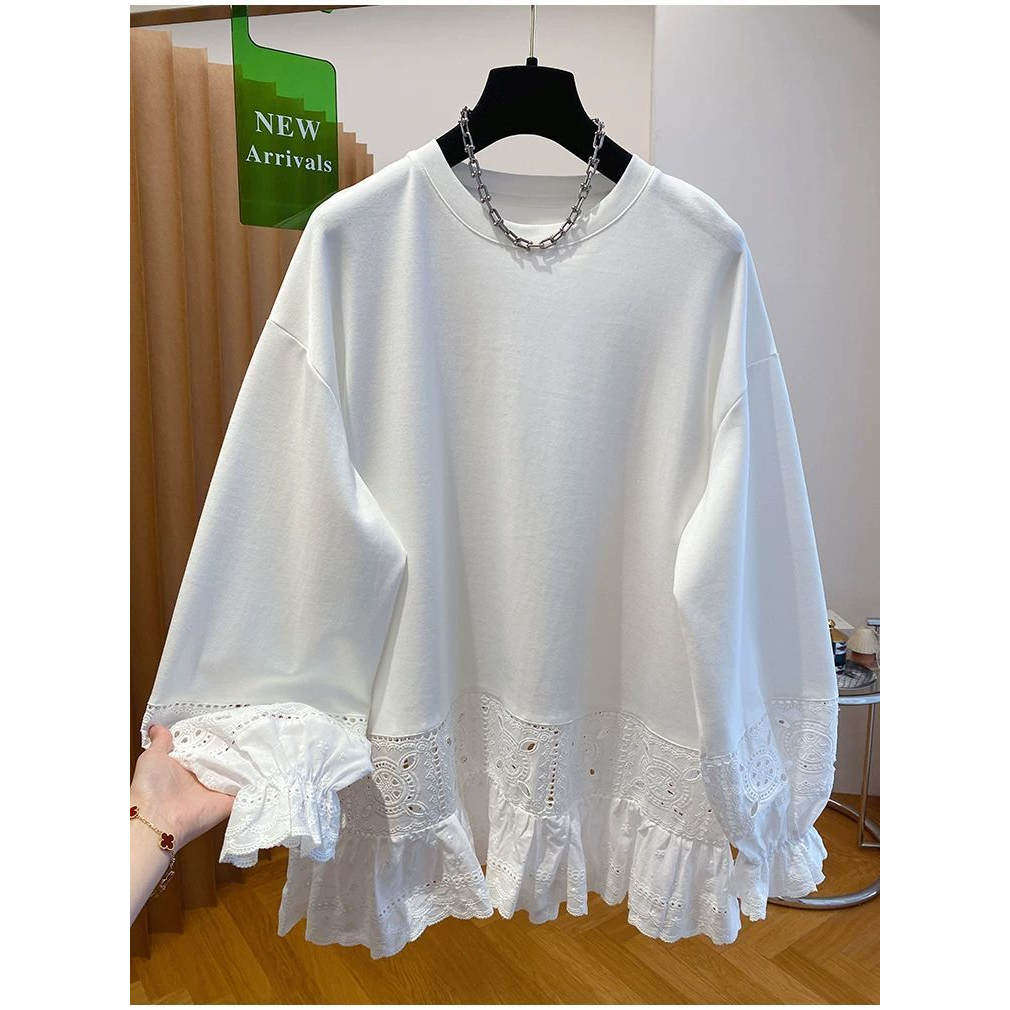 包臀打底衫 纯棉大码 春秋宽松中长款 300斤蕾丝t恤女长袖 上衣 胖mm2