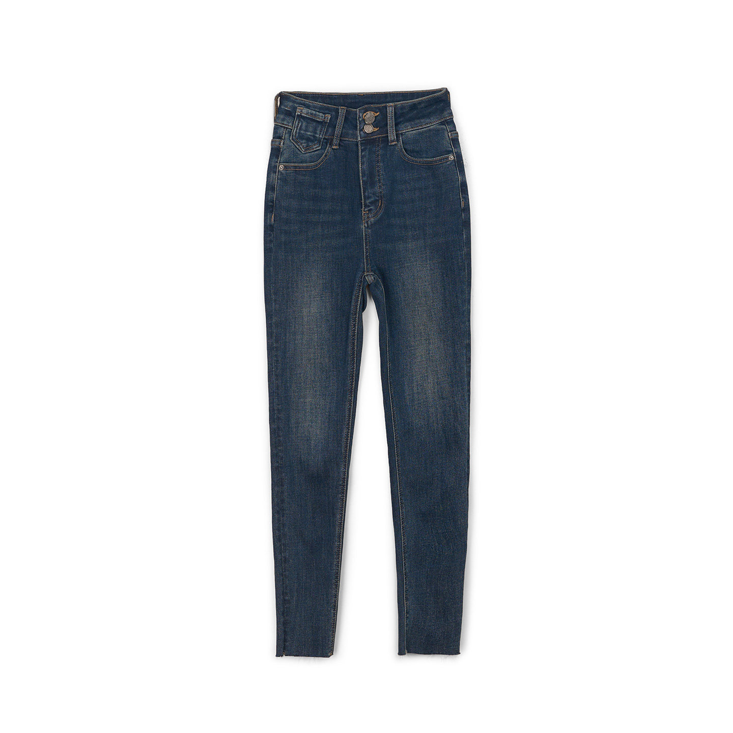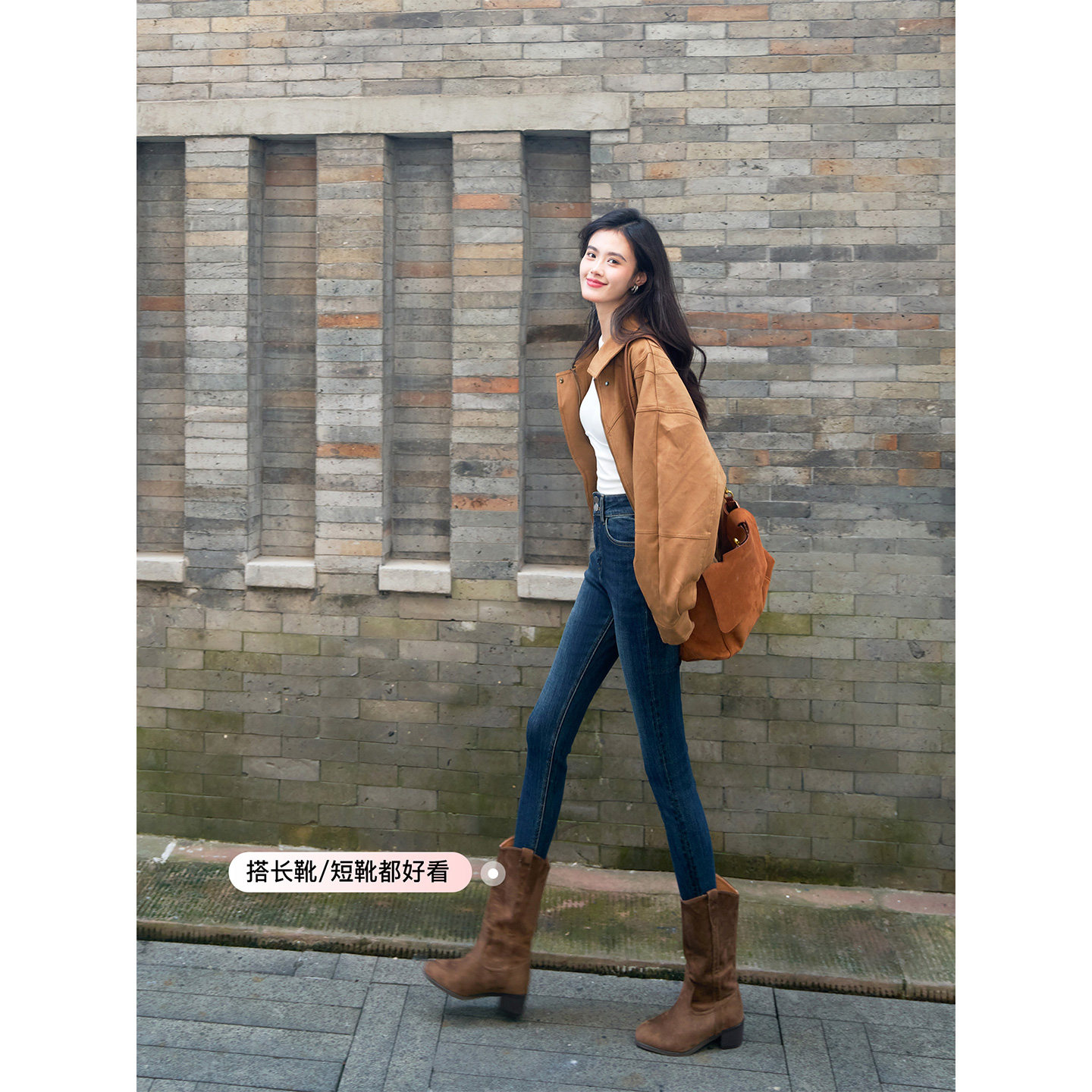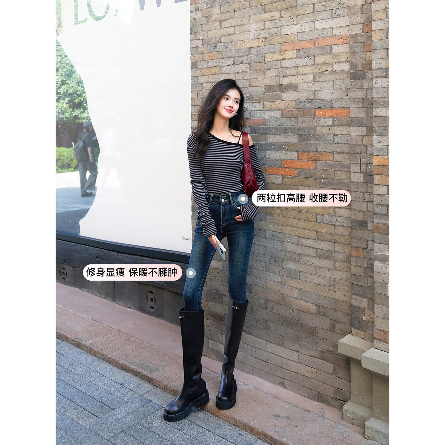 子 薄绒紧身显瘦翻盖提臀九分小脚靴裤 加绒两粒扣高腰牛仔裤 女冬季