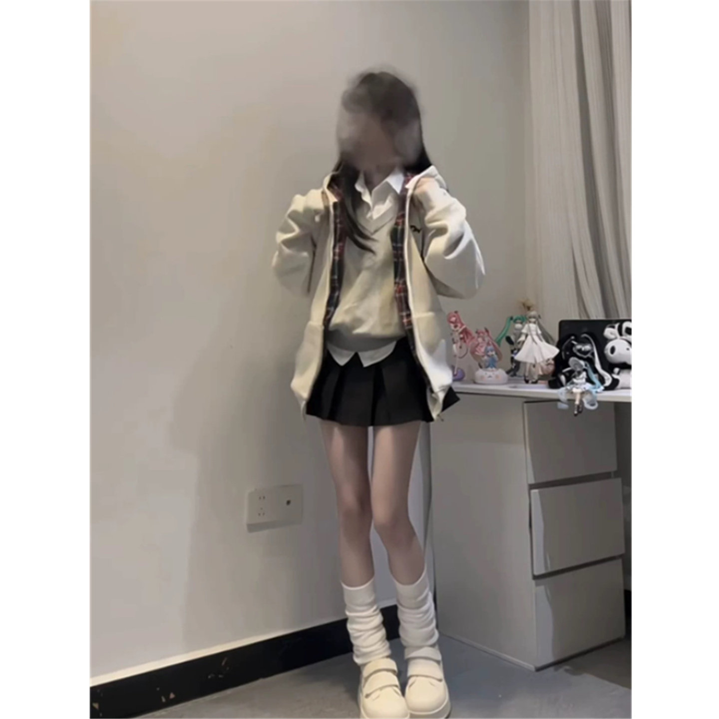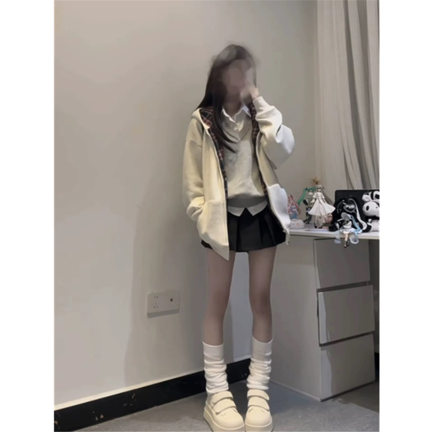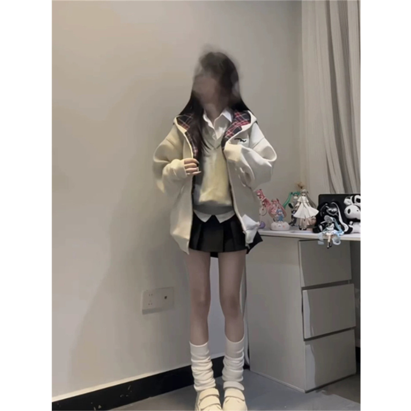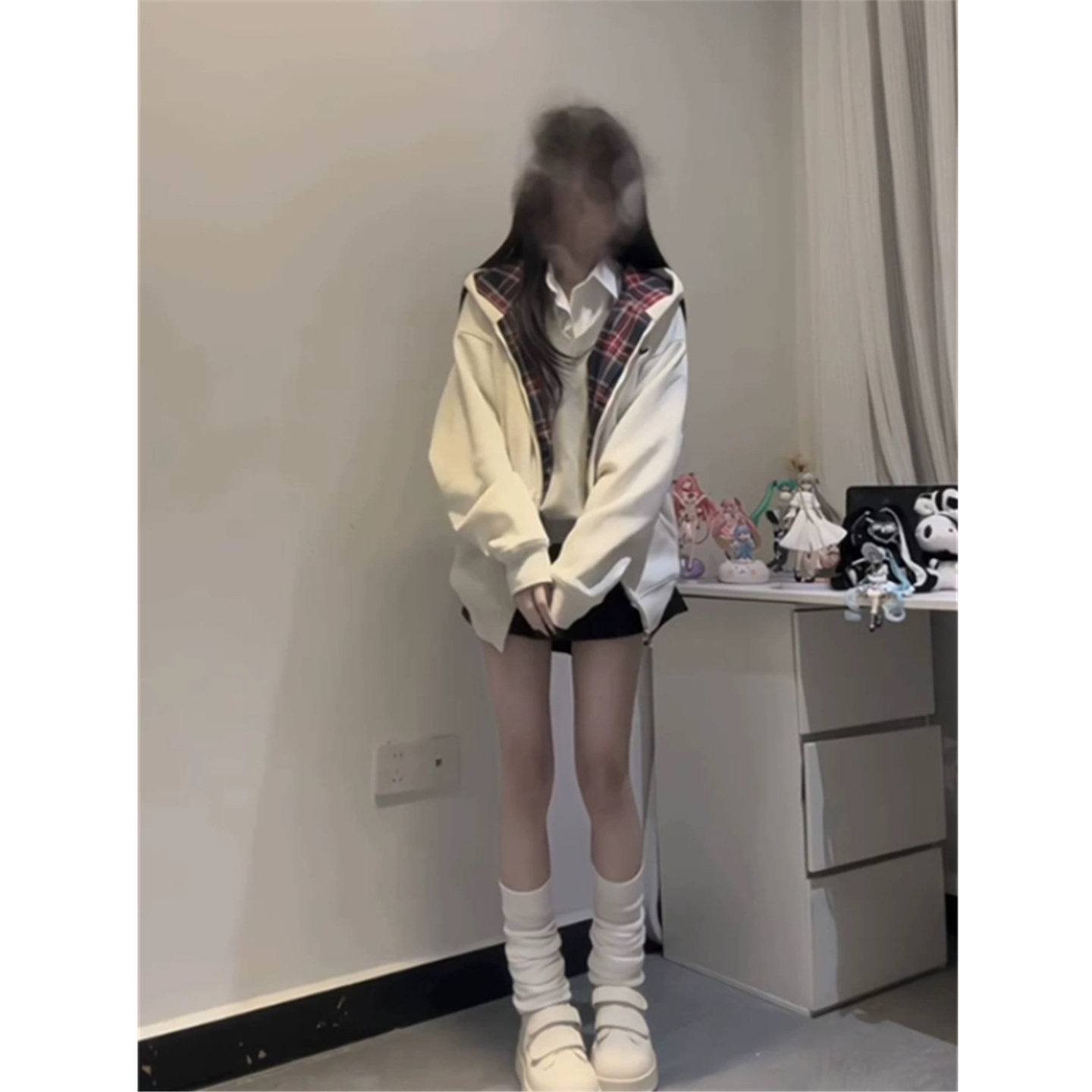 外套 卫衣女春秋oversize宽松慵懒风开衫 美式 复古格子拼接连帽薄款