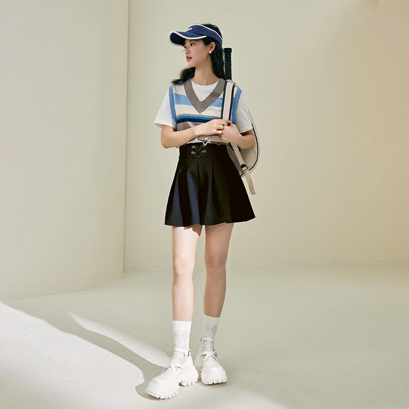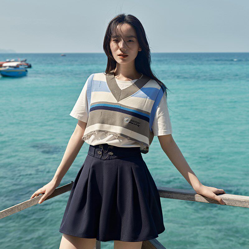 上衣 学院风半袖 PIT拼色圆领针织拼接两件套短袖 T恤女2025春新款