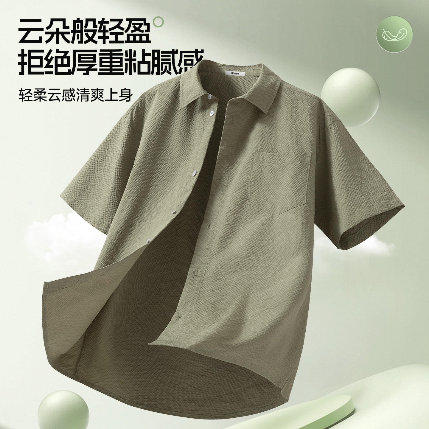 宽松肌理感翻领短袖 简约正肩泡泡纱长袖 男夏季 名创优品白色衬衫
