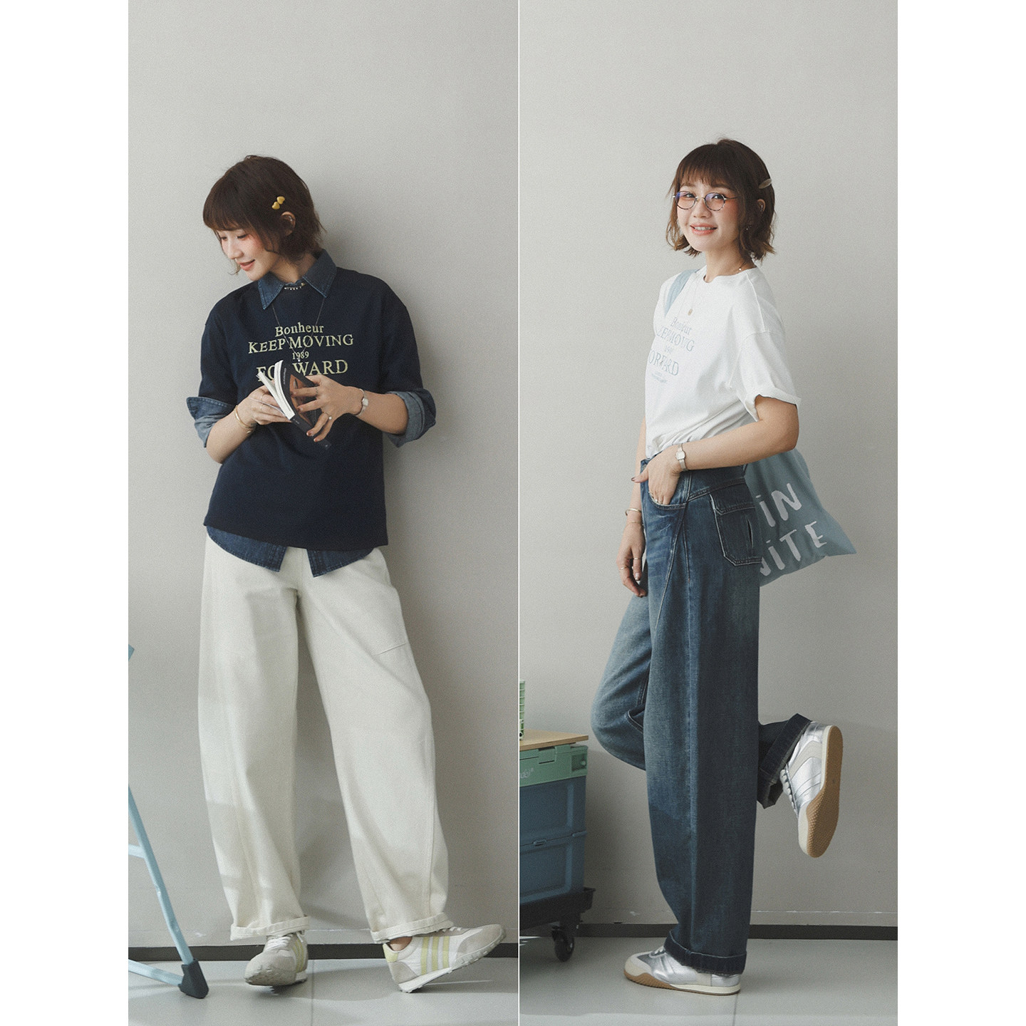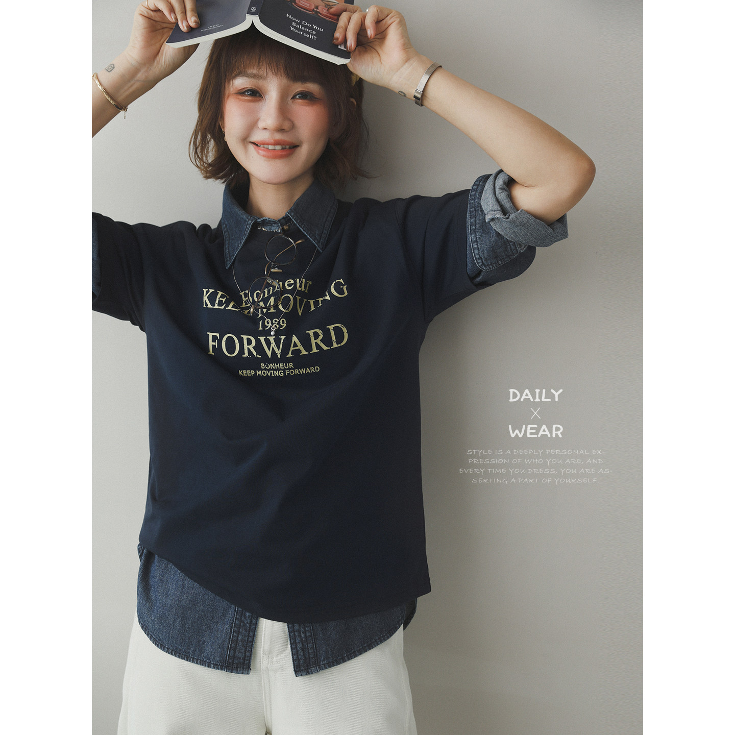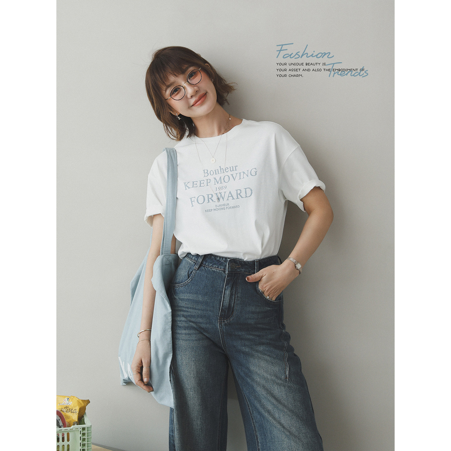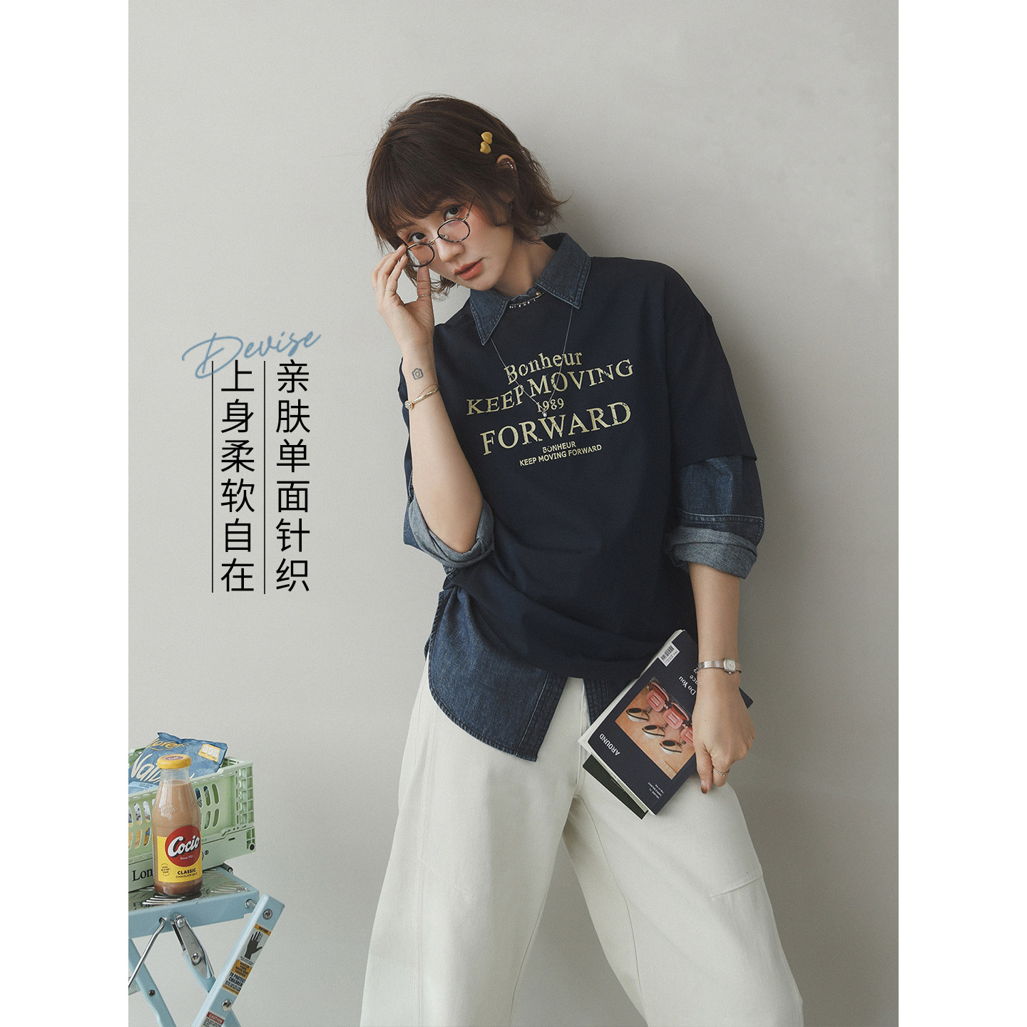 撞色字母印花休闲棉宽松落肩短袖 向往幸福 T恤上衣 生活家 苹果