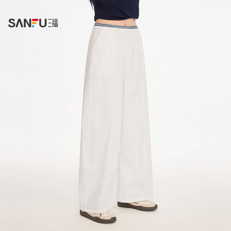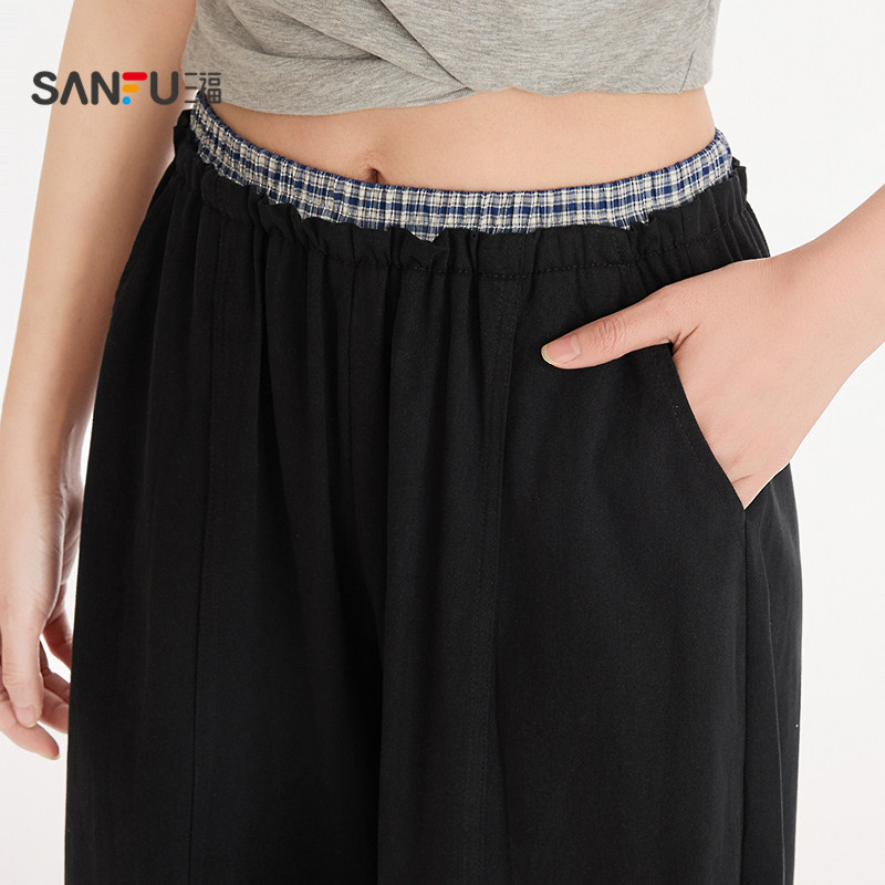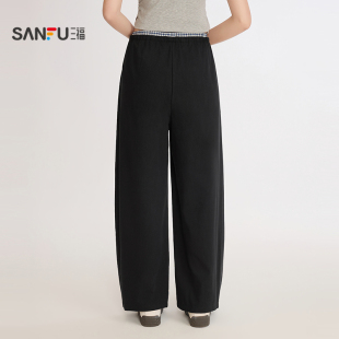 梭织拼格弯刀裤 长裤 单裤 宽松休闲裤 515421 甜酷个性 三福女春季