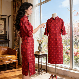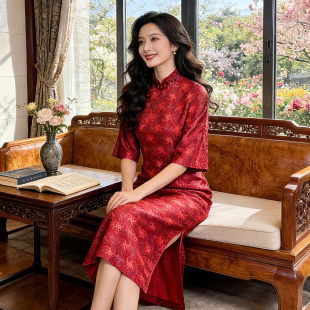 收腰中长款 连衣裙女盘扣修身 订婚婚宴礼服 红色旗袍新中式 2026春季