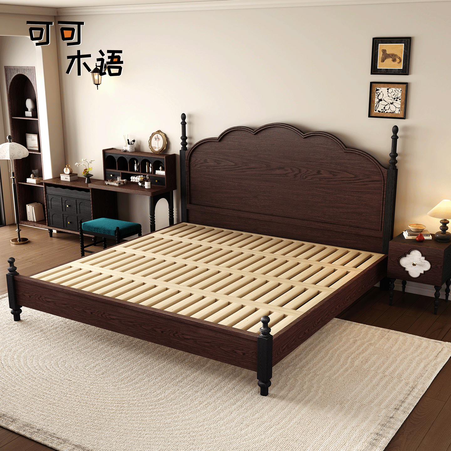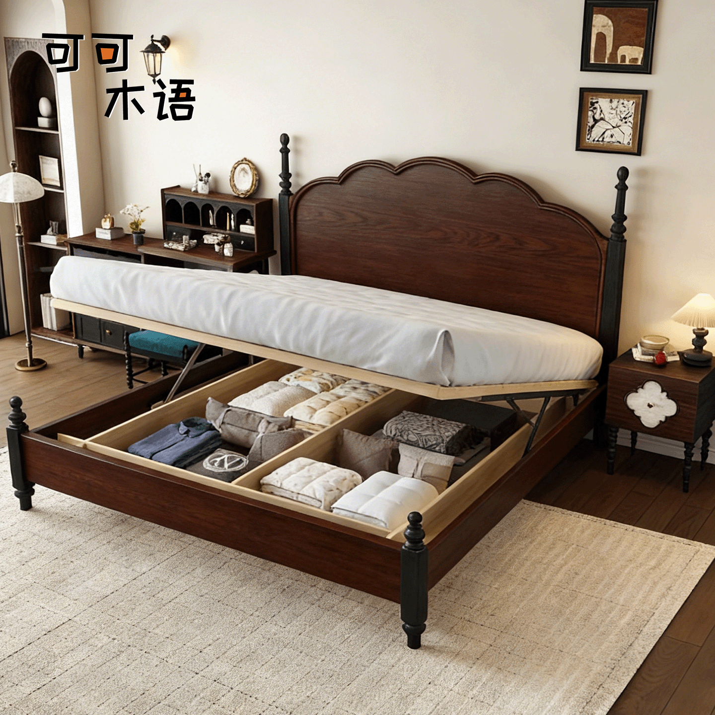 法式 复古红橡木床1.8m中古风实木双人主卧婚床1.5m复古高端储物床