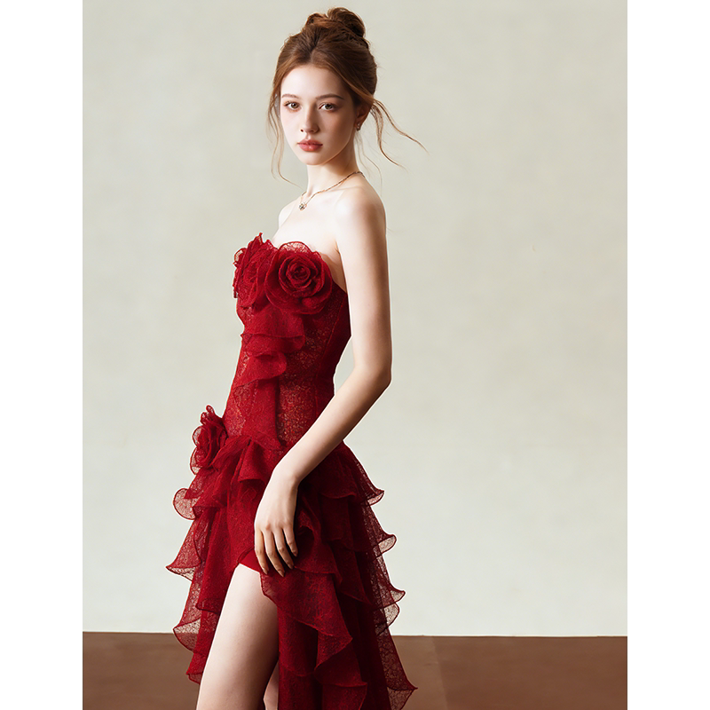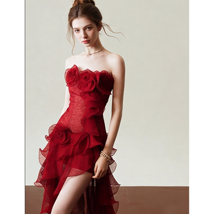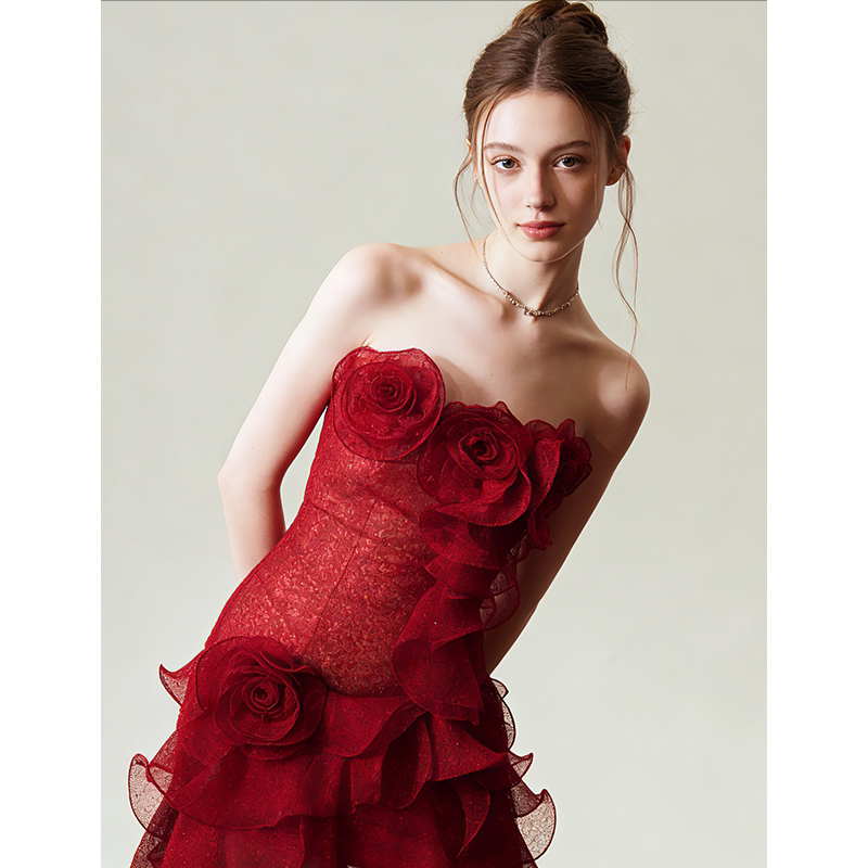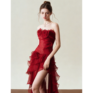 新娘订婚敬酒服 高级感宴会晚装 法式 复古气质红玫瑰抹胸礼服裙修身