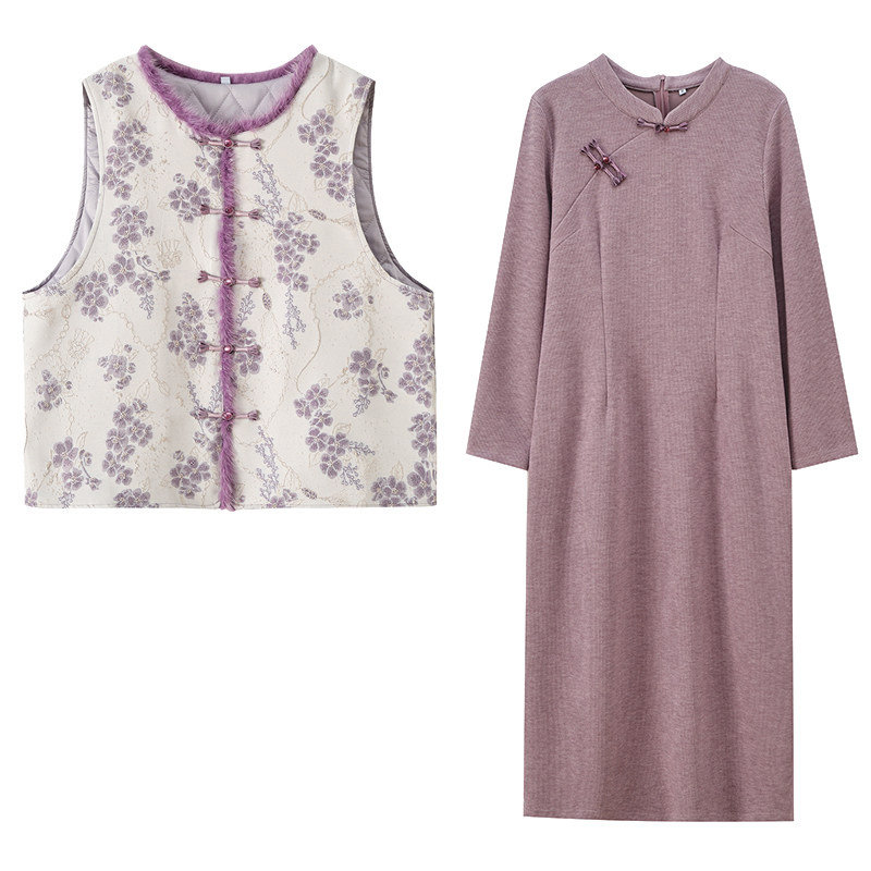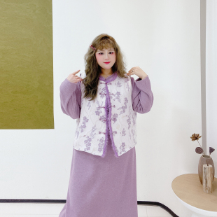 旗袍连衣裙套装 国风显贵穿搭金线提花夹棉毛毛马甲胖莹莹大码 女装