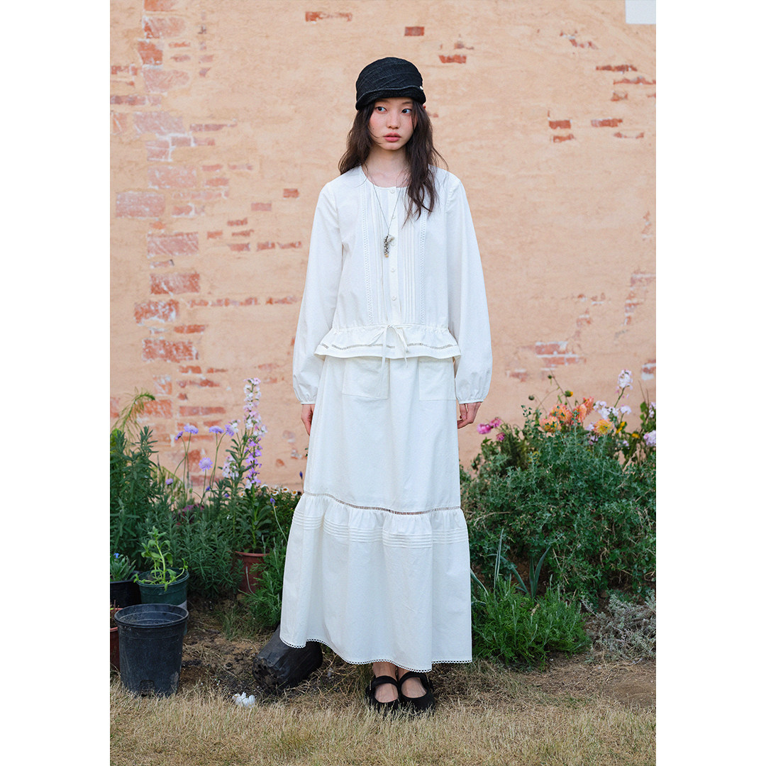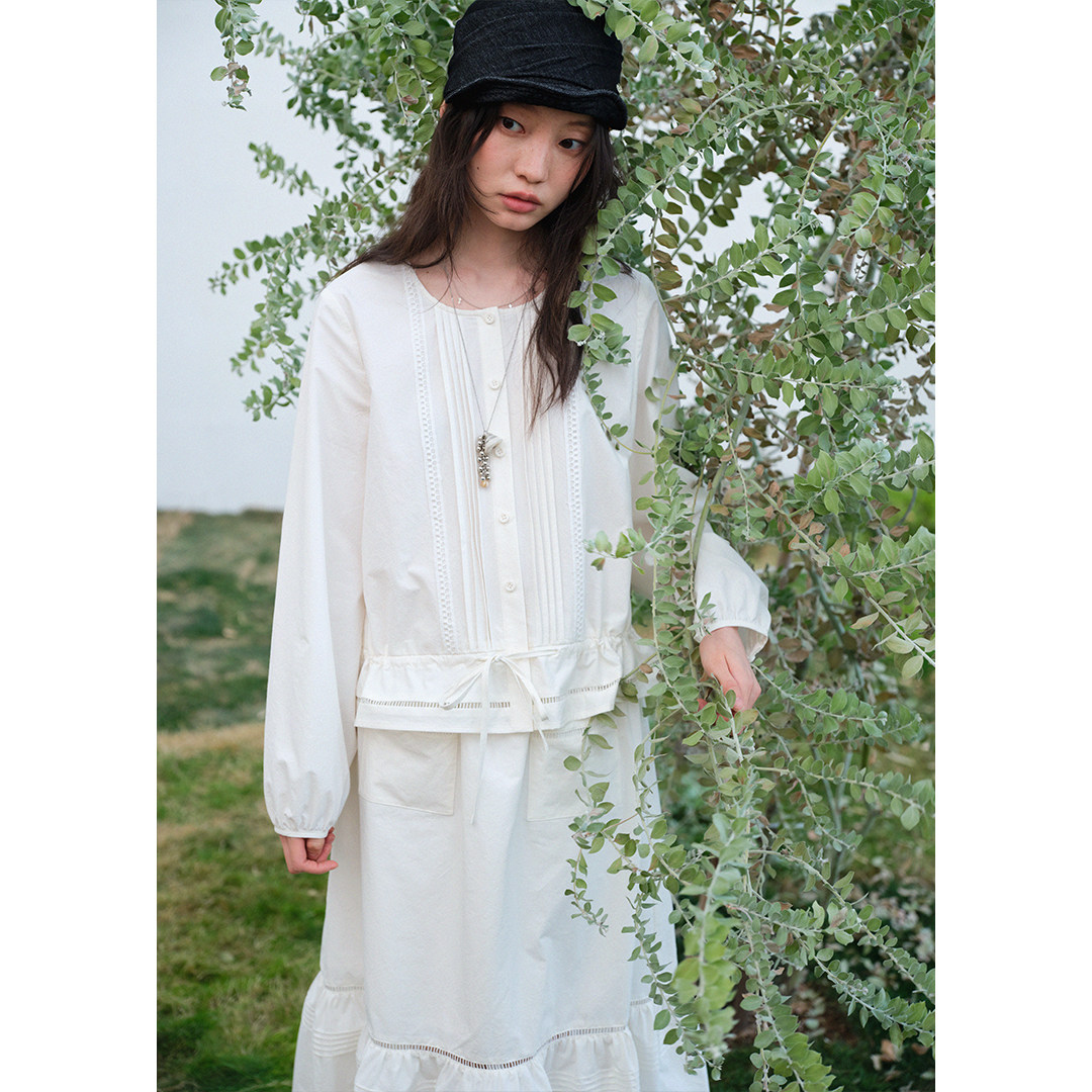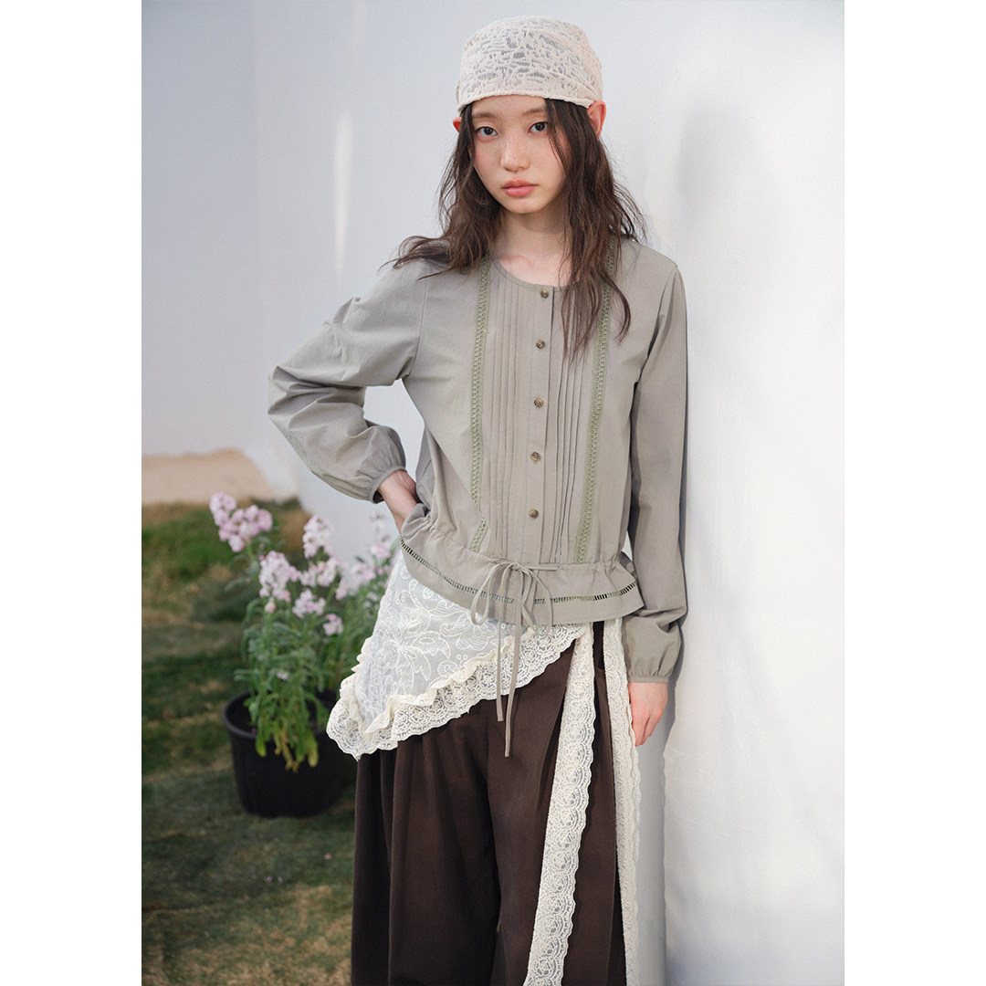 宽松圆领花边绑带收腰长袖 春季 衬衫 衬衣套装 女纯棉短款 BLUEerror