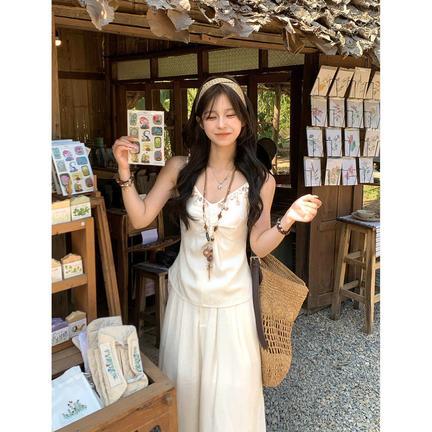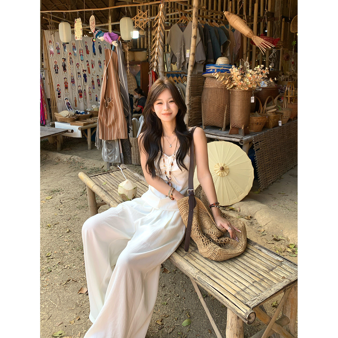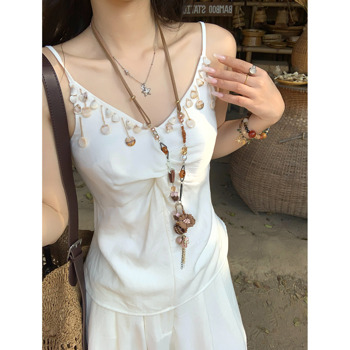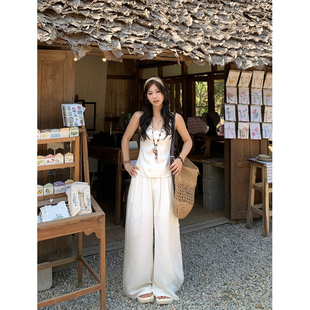 女 波西米亚风休闲显瘦度假仿亚麻阔腿裤 Adan贝壳纽结吊带套装 夏季