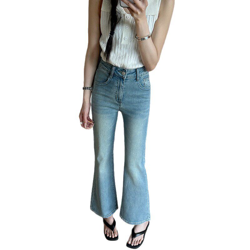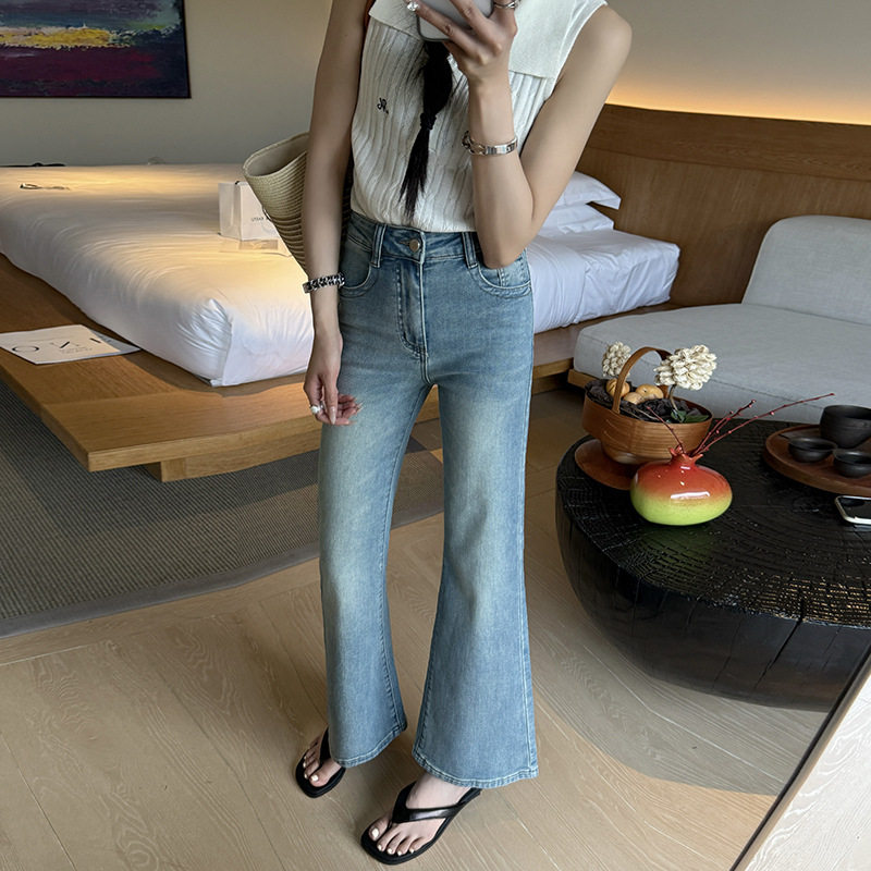 简约高腰弹力小个子九分微辣裤 女夏季 子 辣妹喇叭牛仔裤 代陌嘉女装