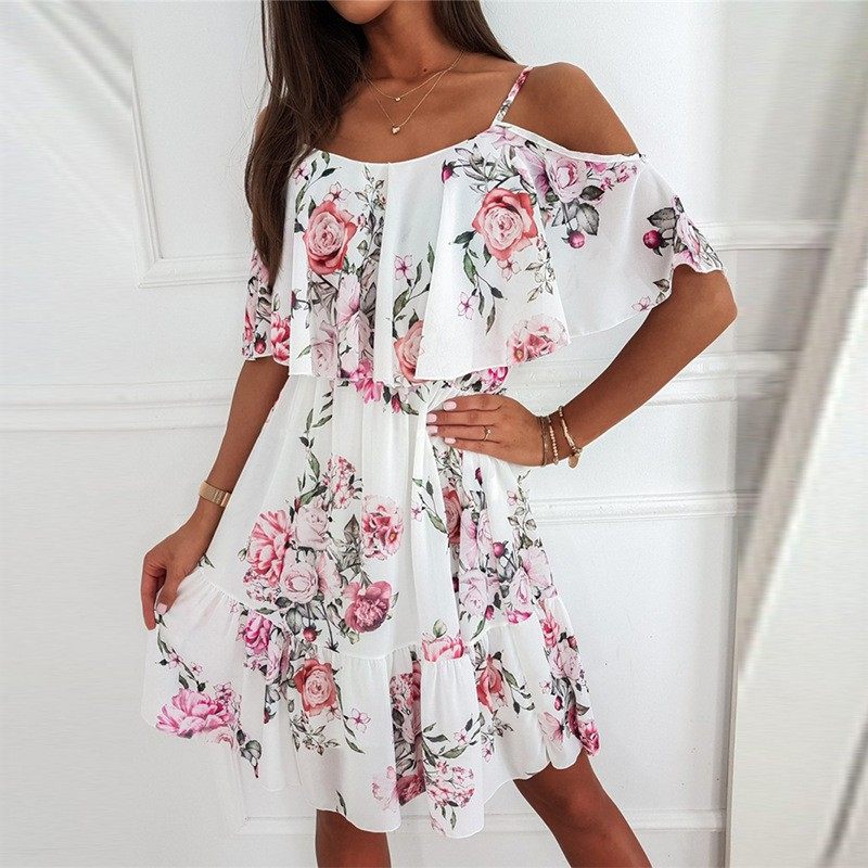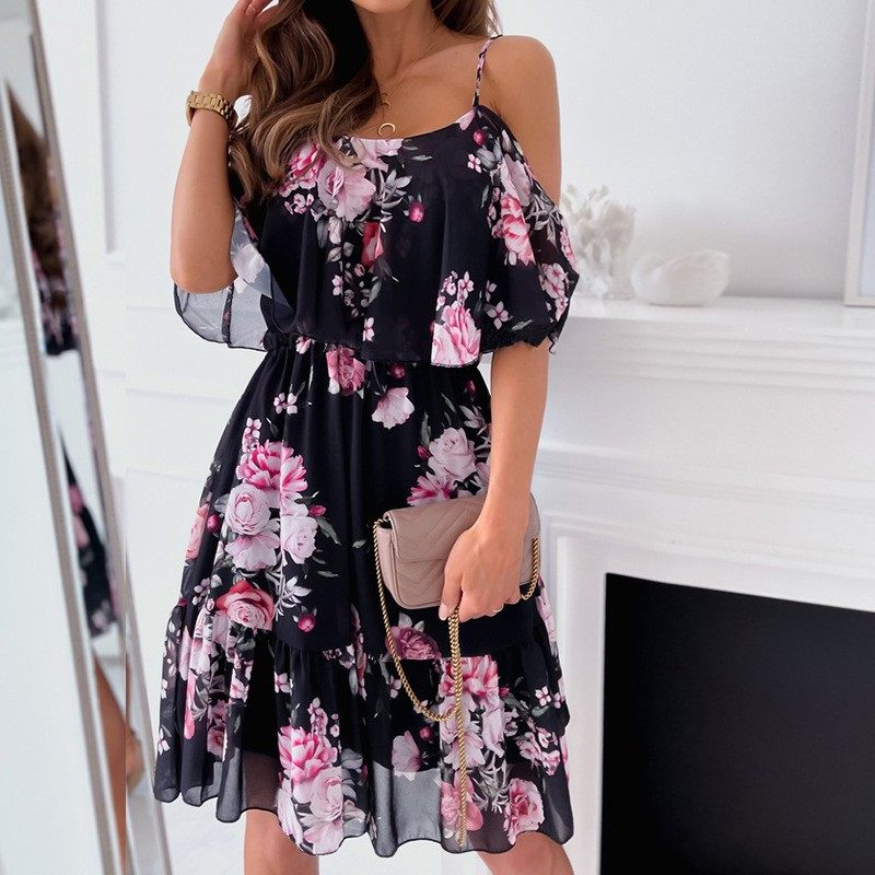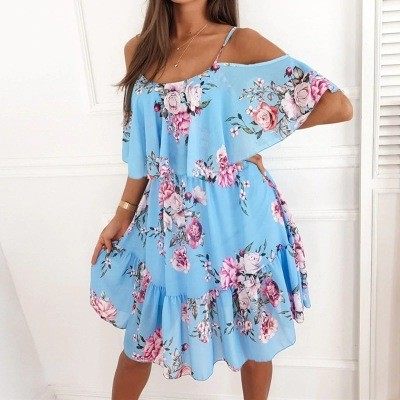 连衣裙 雪纺印花露肩性感连衣裙时尚 跨境速卖通亚马逊新款 春季