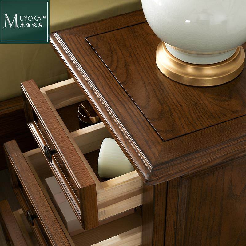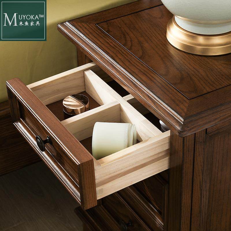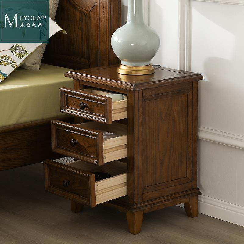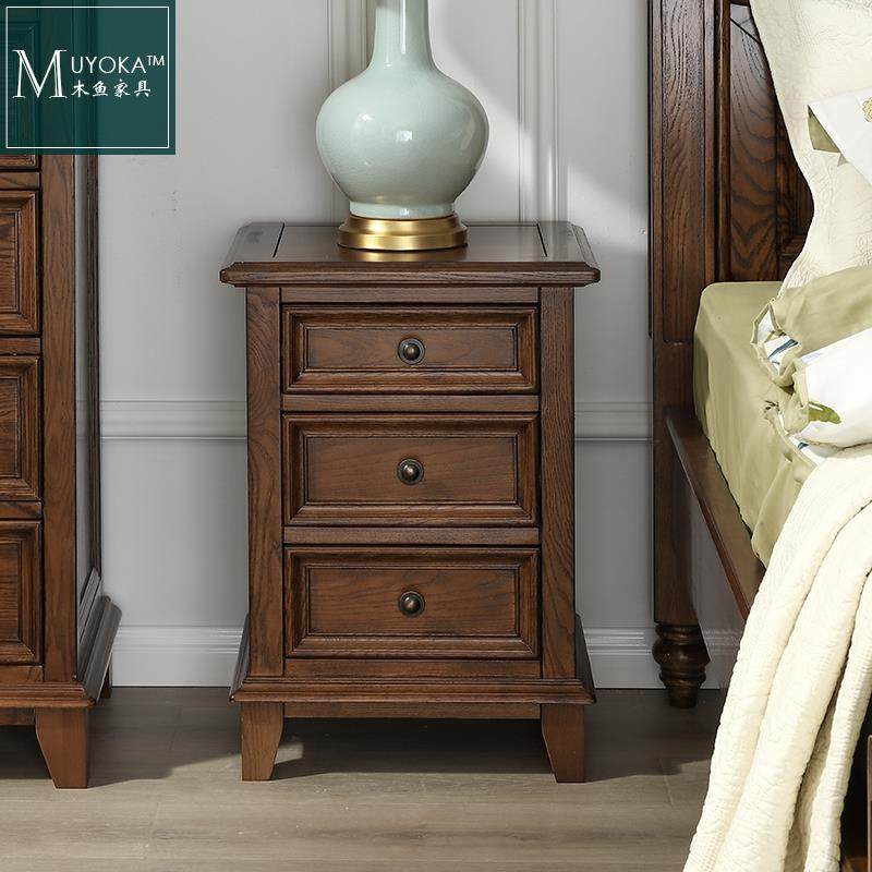 8V美式 乡村白蜡木胡桃色实木45三抽屉床头柜卧室床边储物柜客厅儿