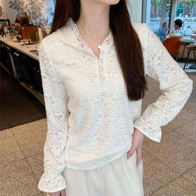 时尚 女秋冬新款 宽松别致连帽内搭长1219e 绣花加绒蕾丝打底衫 法式
