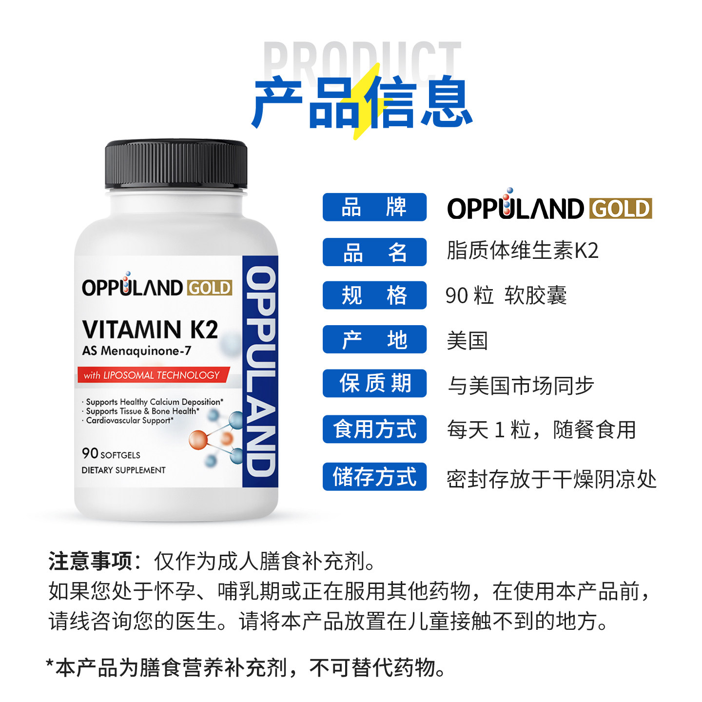 Oppuland 7型脂质体vk2补钙搭档美国进口 Gold维生素K2促钙吸收MK