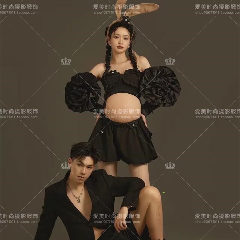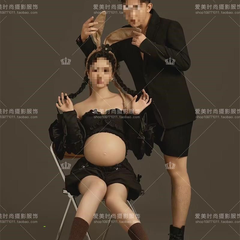 孕妈咪辣妈艺术照摄影服装 影楼情侣孕妇主题拍照新款 冷酷黑色套装