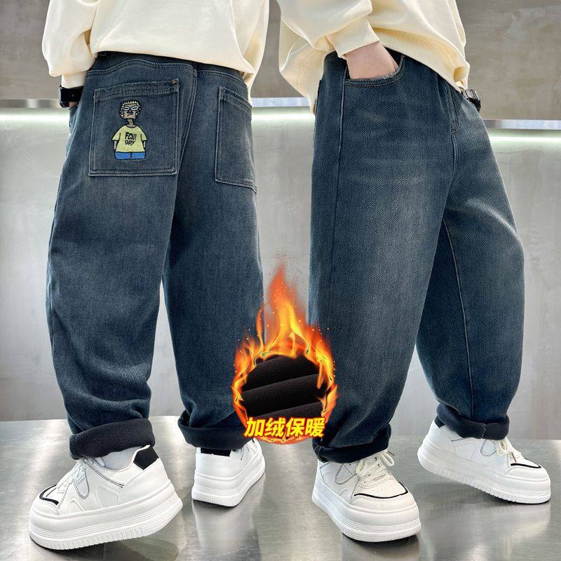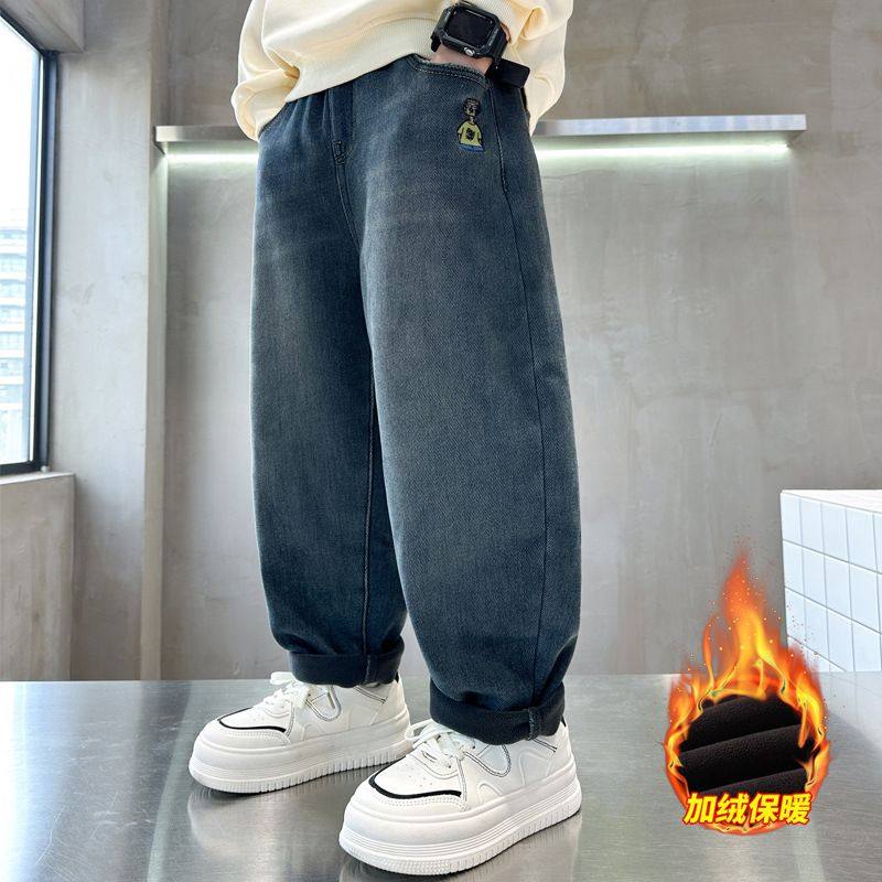 冬装 儿童加绒加厚一体绒保暖长裤 2025秋冬新款 男童加绒弯刀牛仔裤
