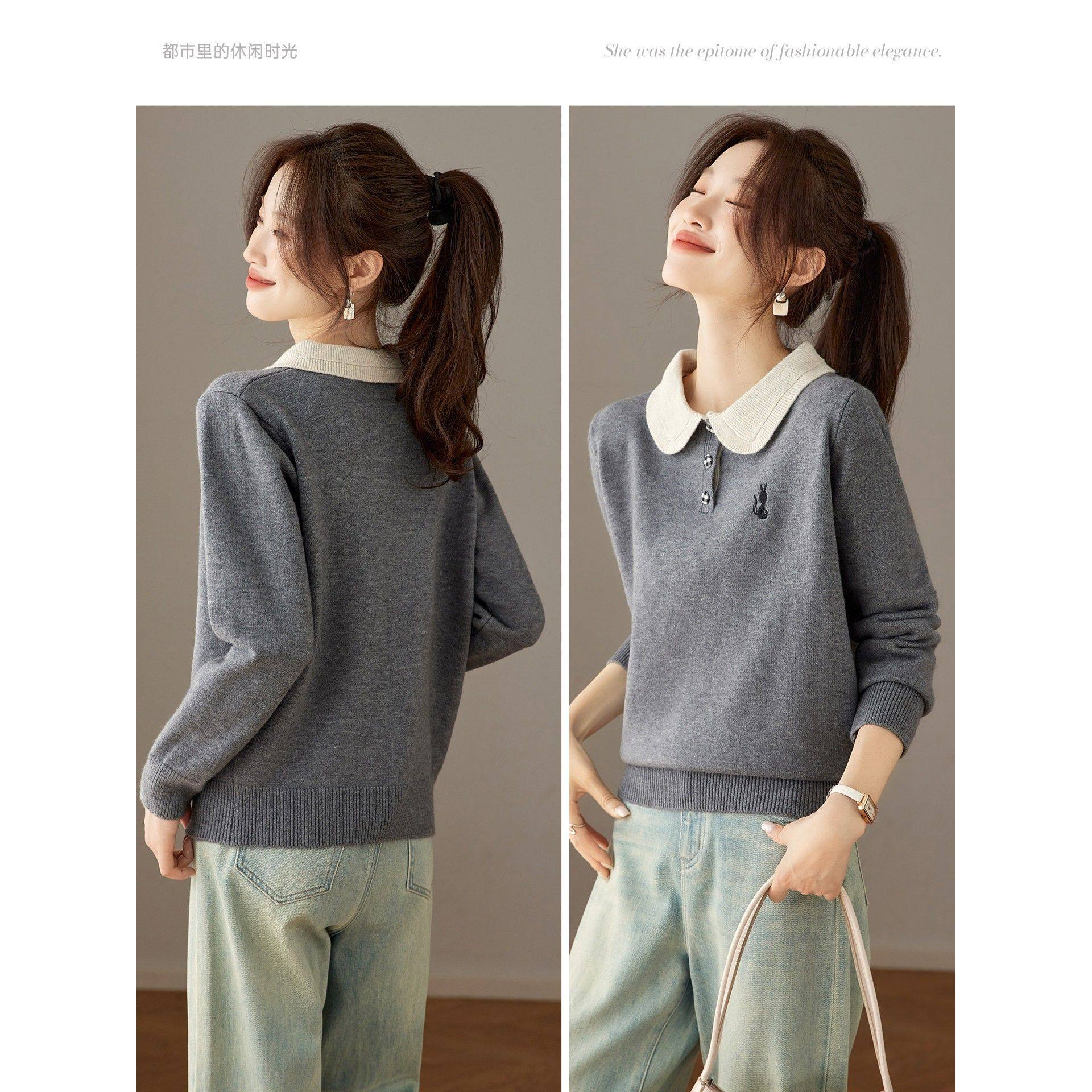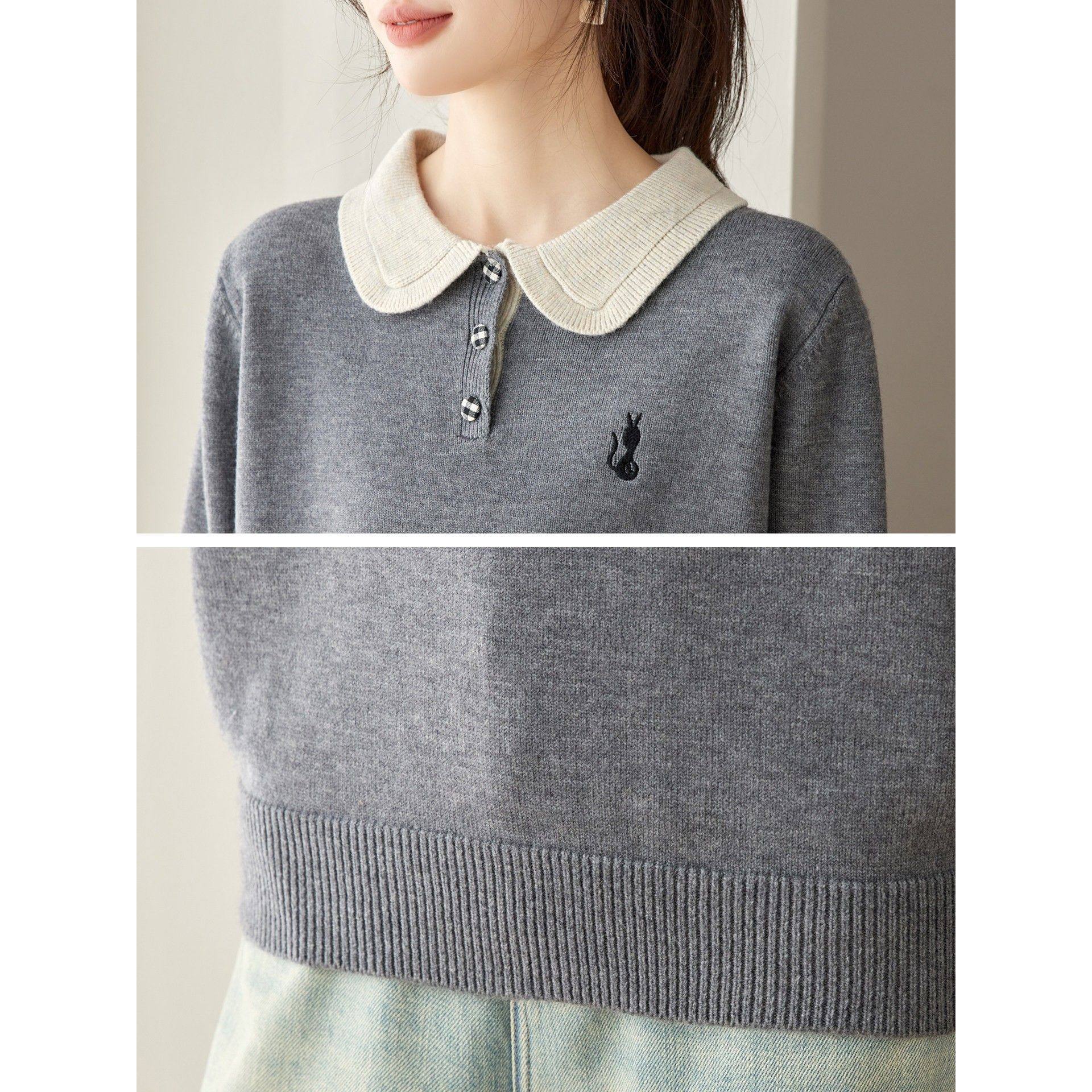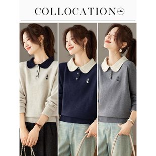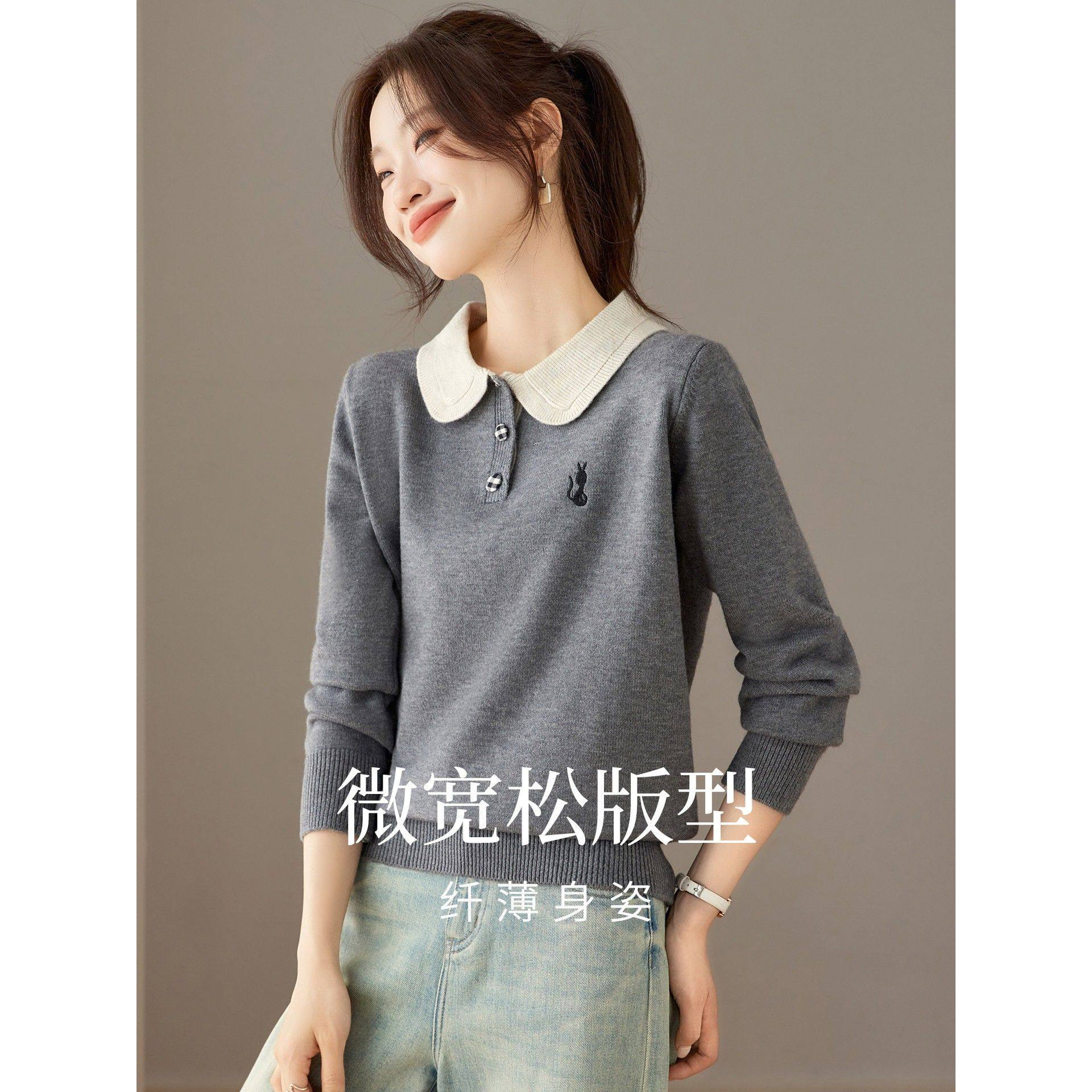 上衣女灰色单穿宽松毛衣 洋气减龄漂亮娃娃领针织衫 2025新款 秋冬季