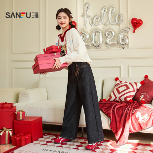 2026新款 女装 春季 宽松阔腿长裤 515920 趣味小马挂饰时尚 三福牛仔裤