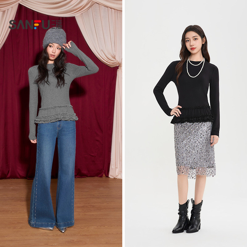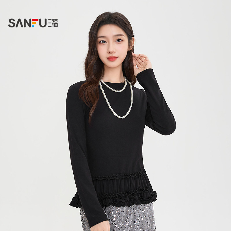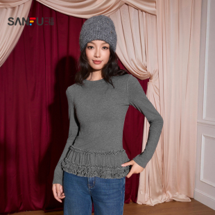 甜美多层木耳花边摆圆领上衣女装 春季 516118 T恤2026新款 三福长袖