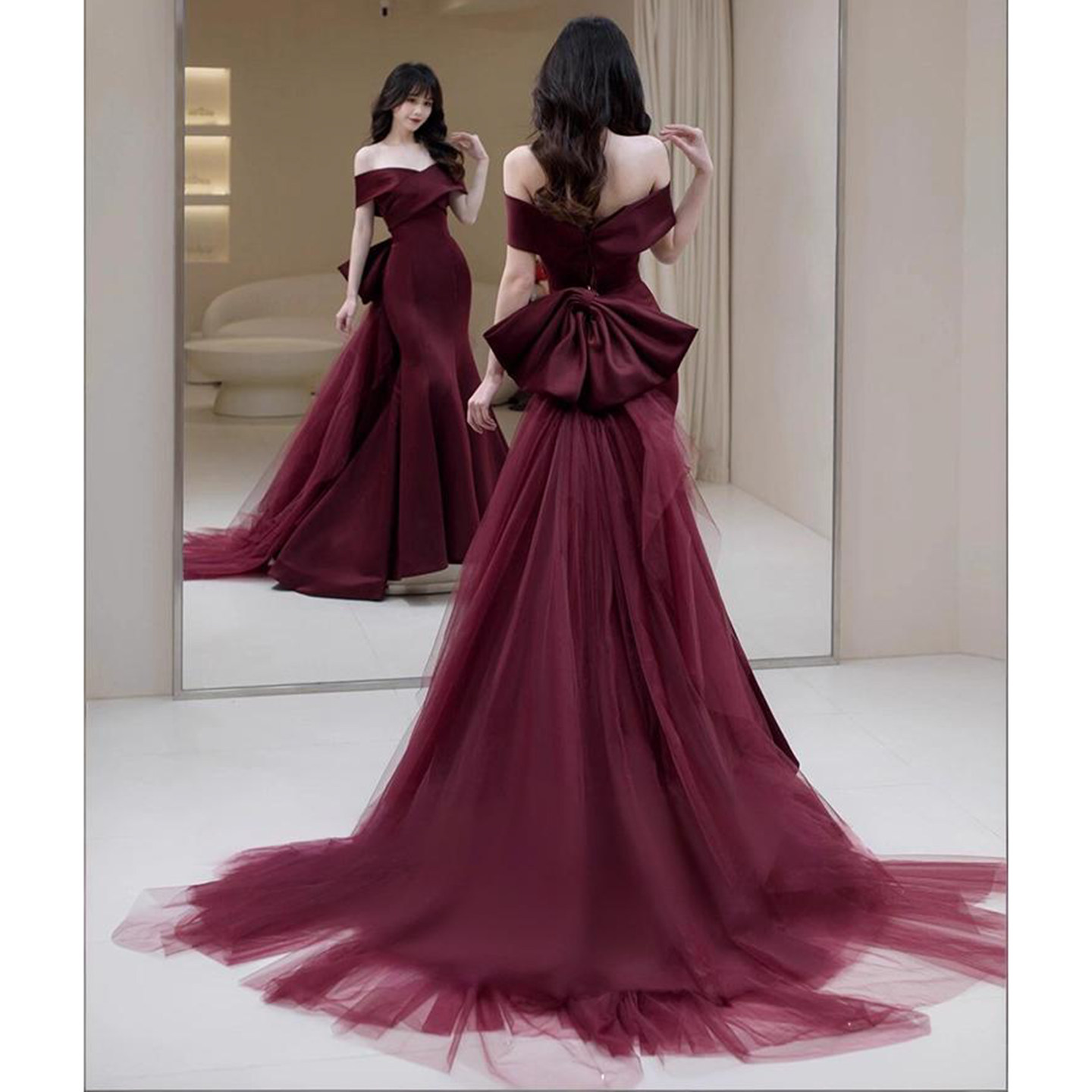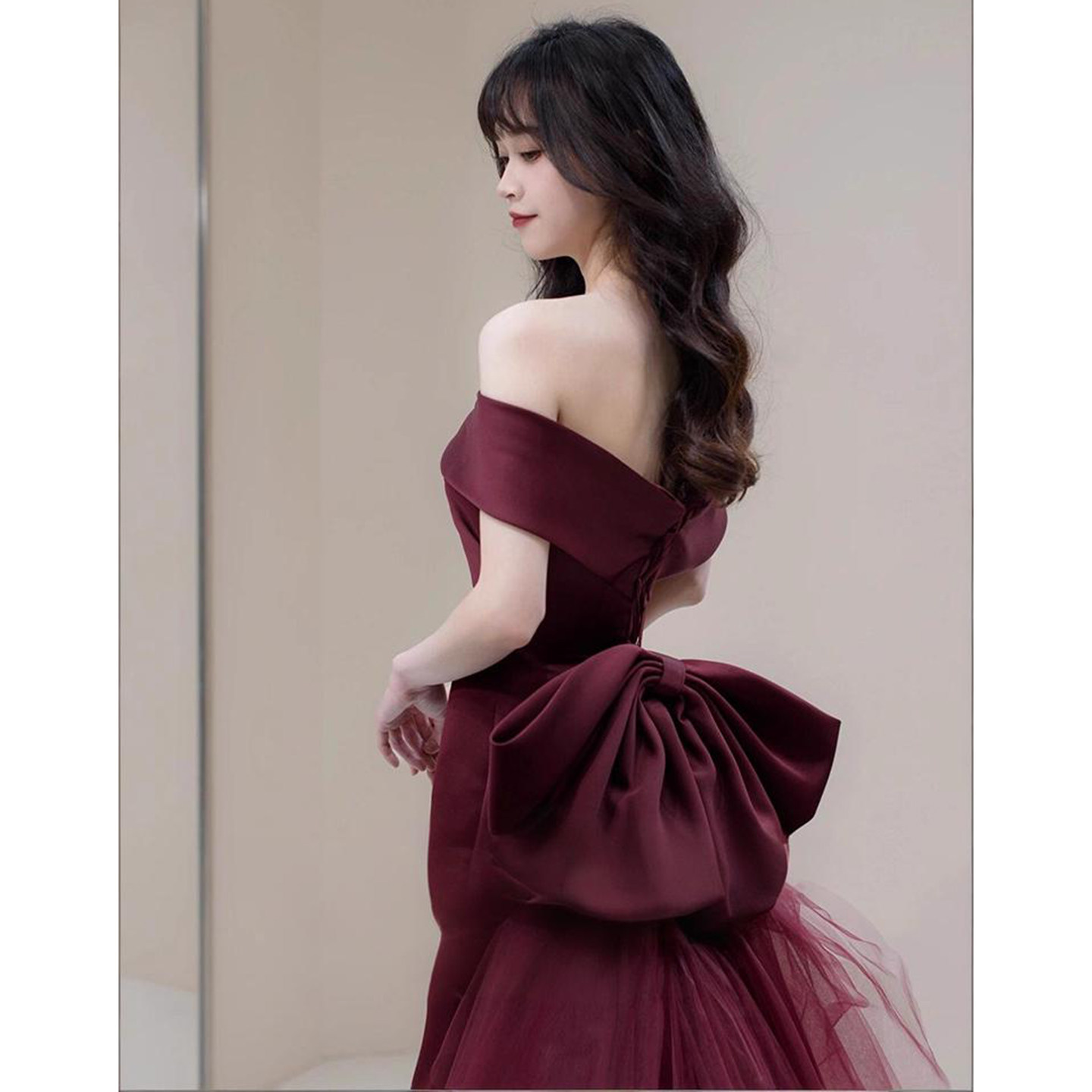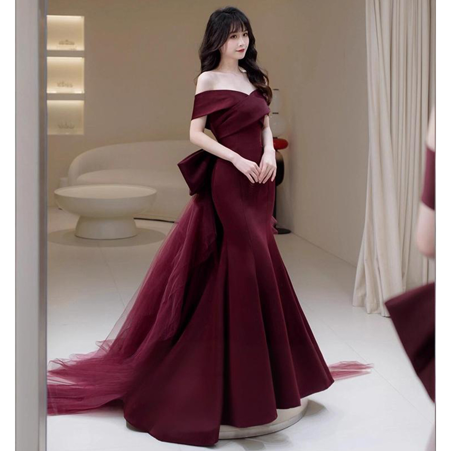 鱼尾敬酒服一字肩新娘晨袍结婚订婚高级感礼服裙酒红色缎面轻婚纱