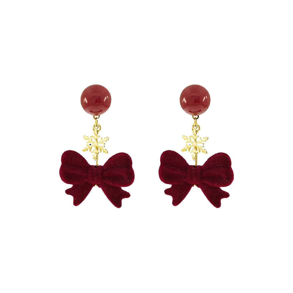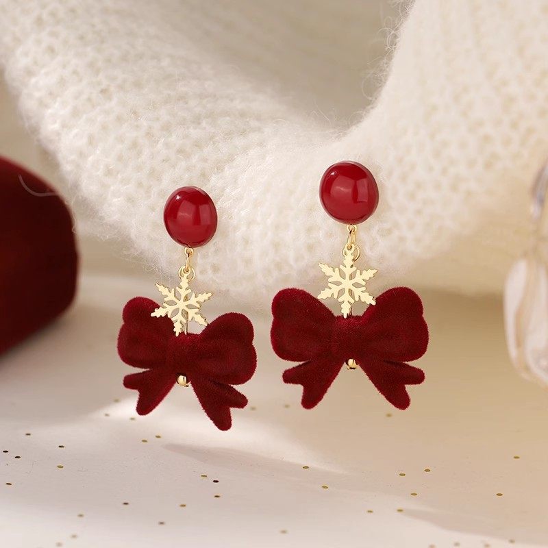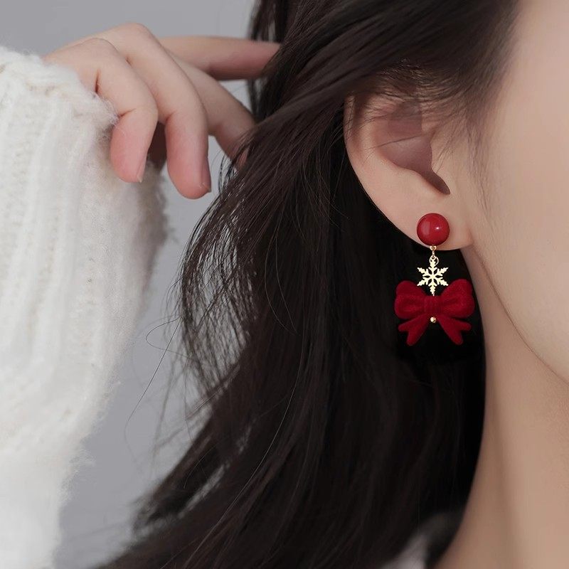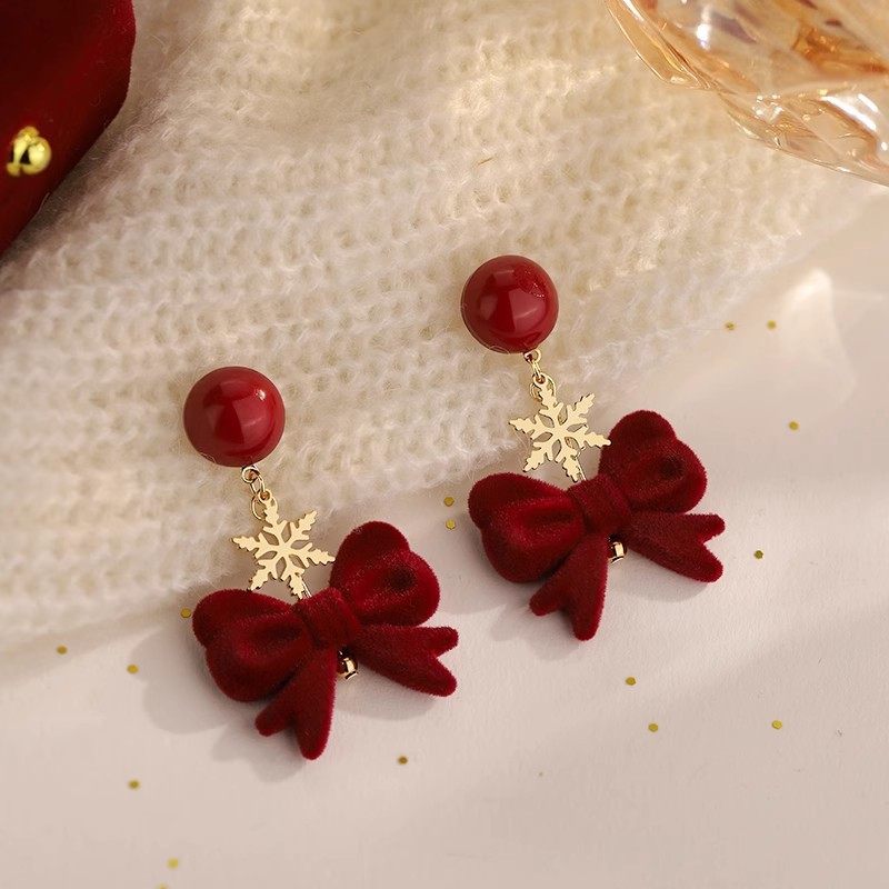 红色植绒蝴蝶结耳环过年喜庆秋冬款 圣诞雪花高级感精致耳钉耳饰品