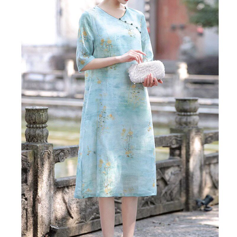 胖mm200斤宽松显瘦复古印花改良版 连衣裙2024夏装 旗袍裙 女装 大码