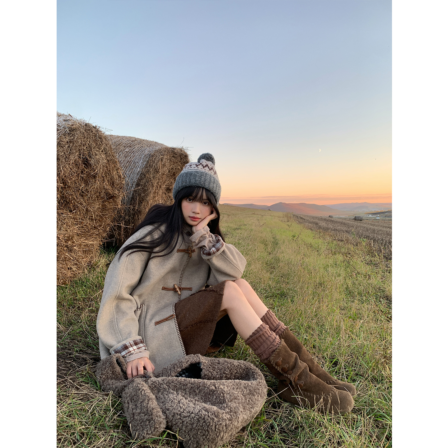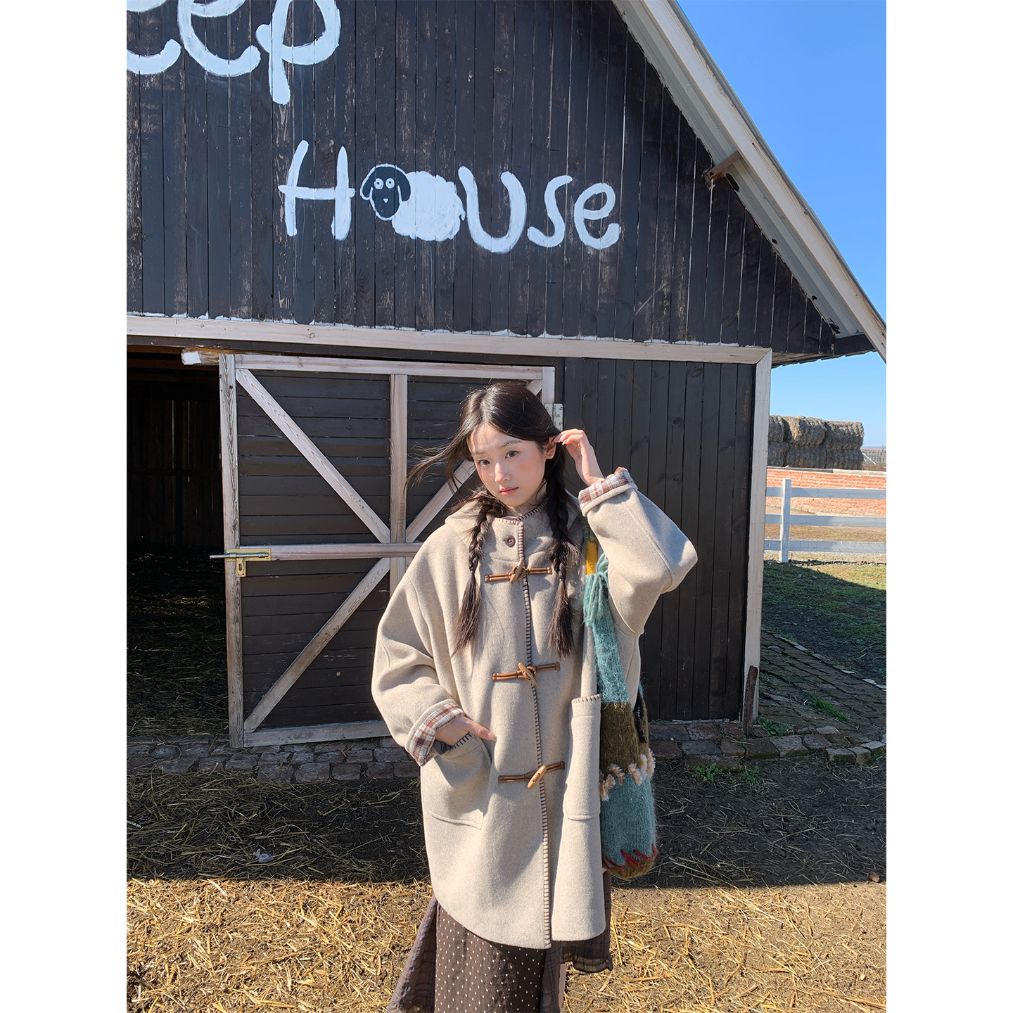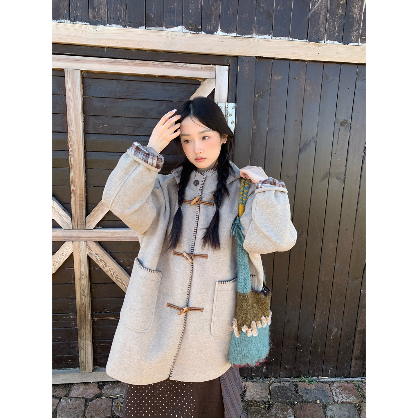 霍里德地图 复古牛角扣夹棉毛呢大衣女冬贝壳绣格纹拼接连帽外套