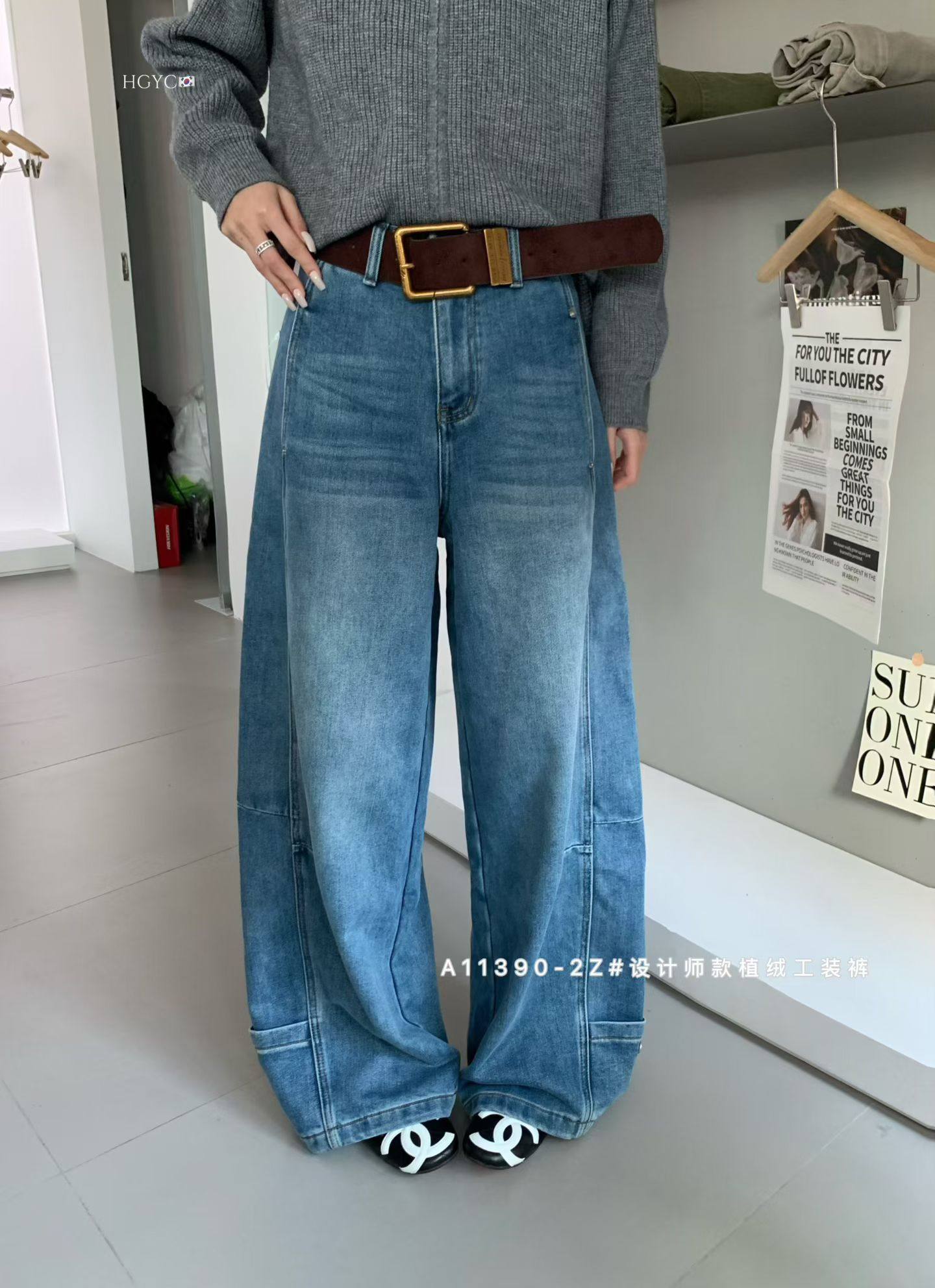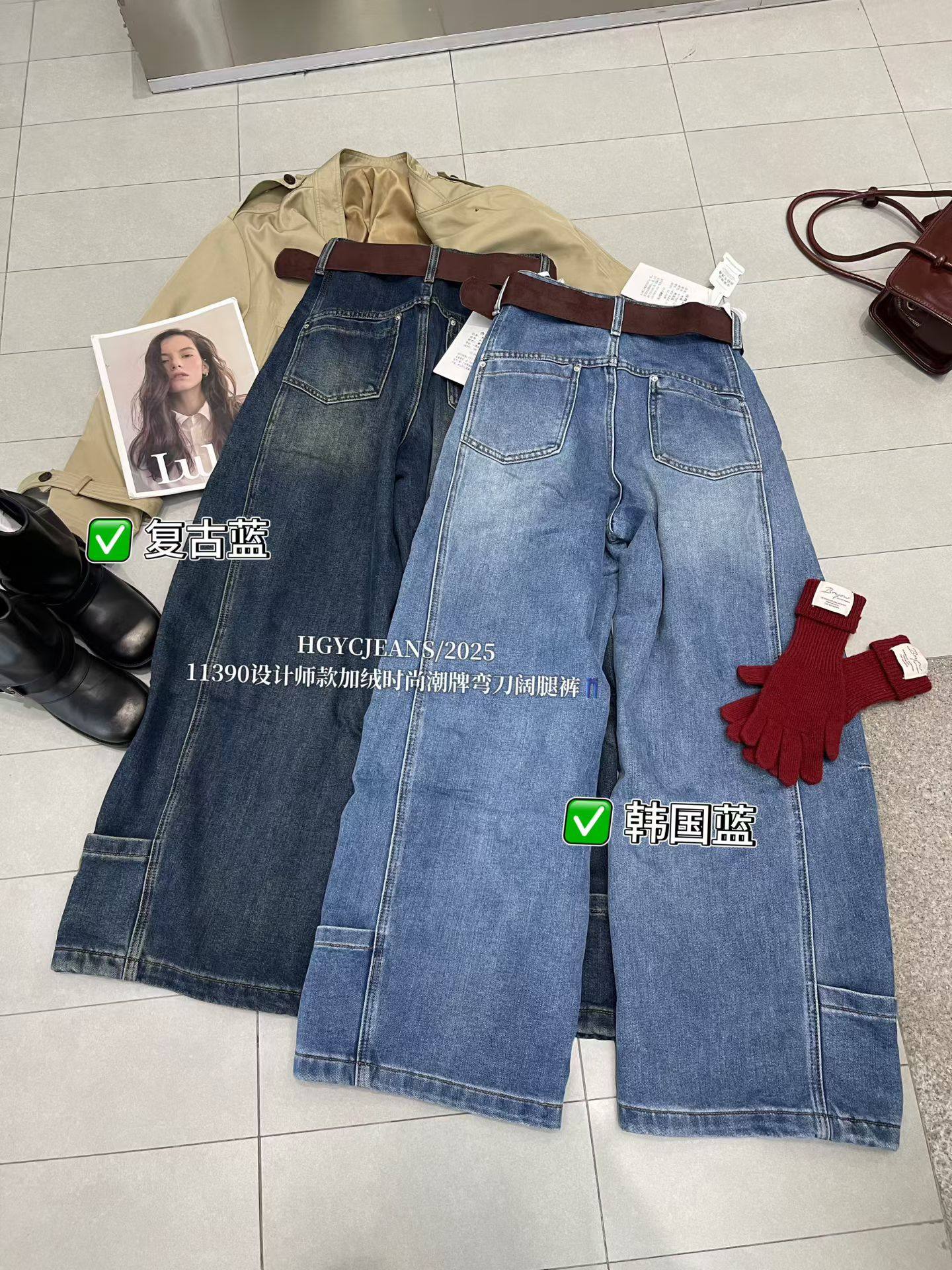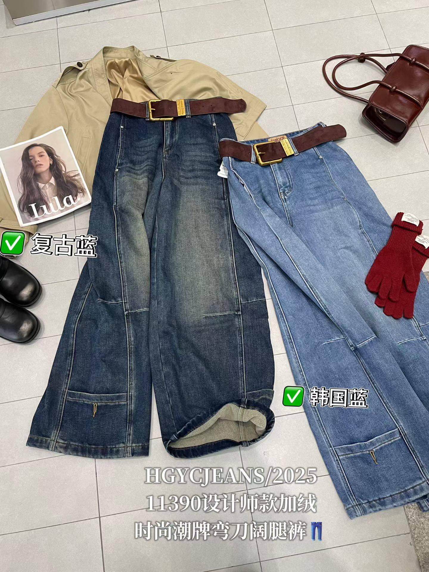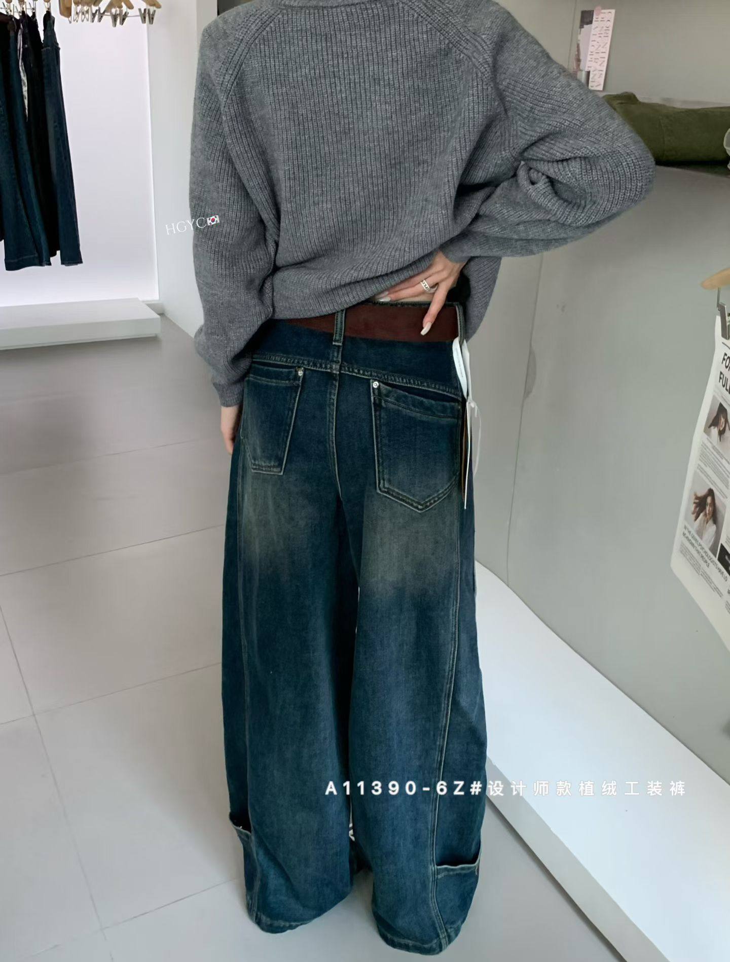 长裤 十三行冬季 女高腰宽松显瘦阔腿设计感工装 植绒牛仔裤 新款