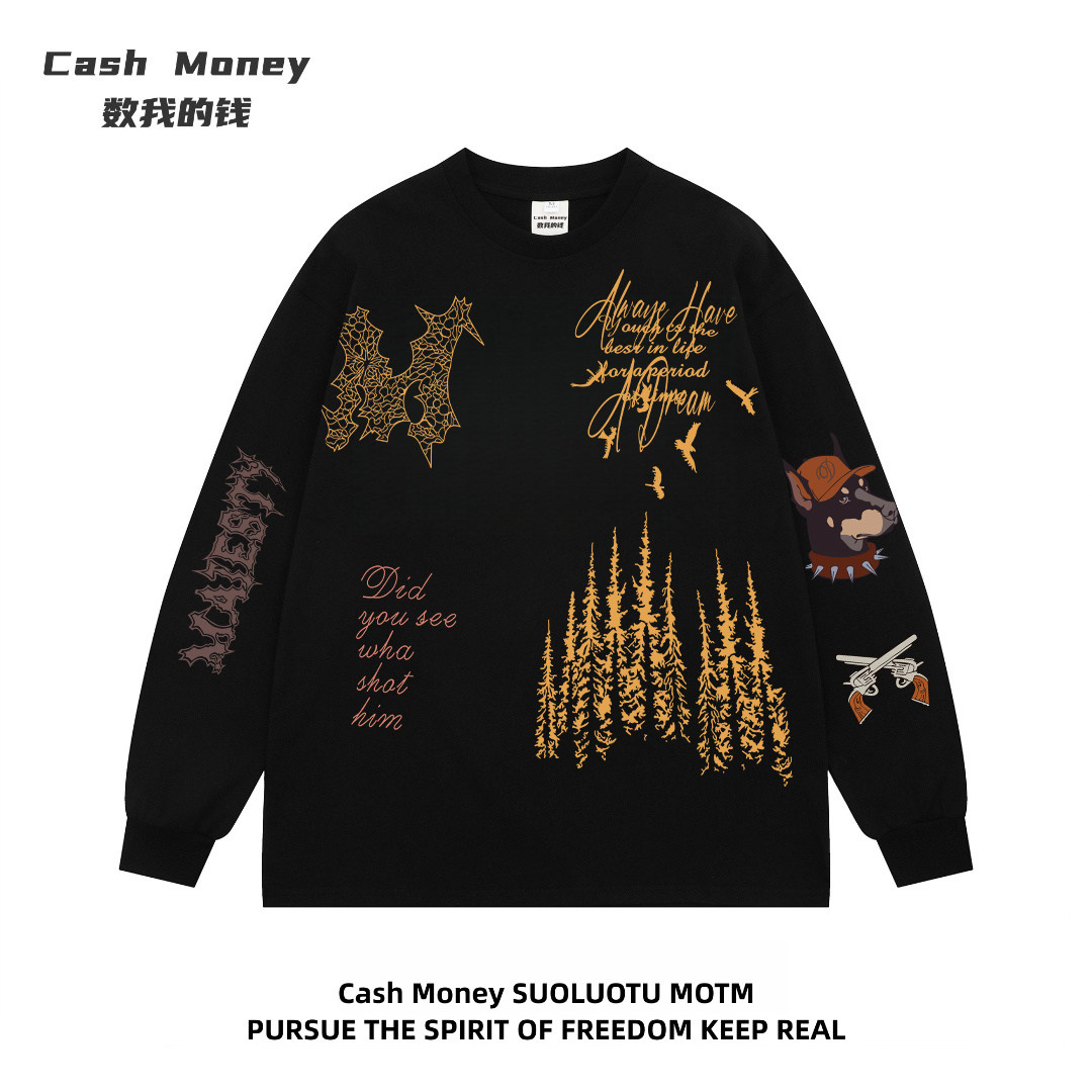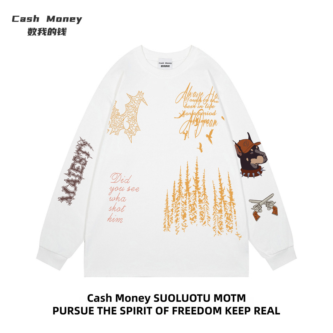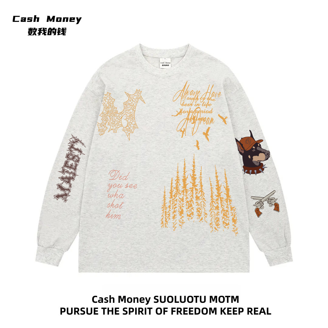 复古设计感套头T恤长袖 Cash 美式 钱 男女高街百搭上衣 Money数我