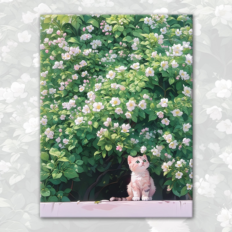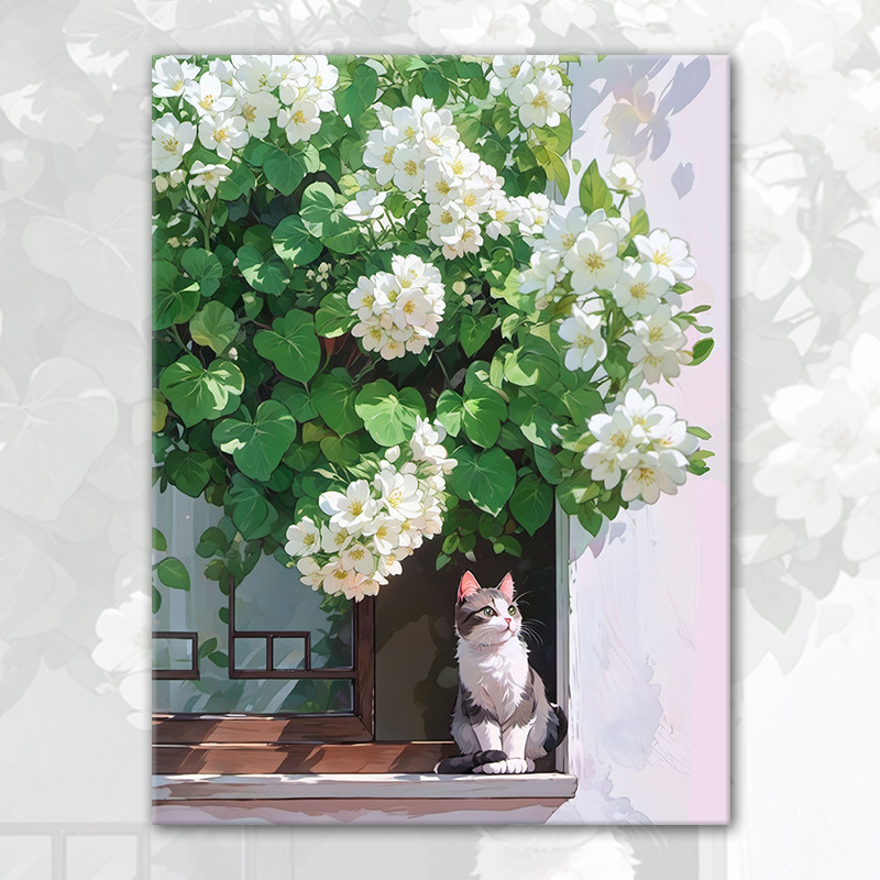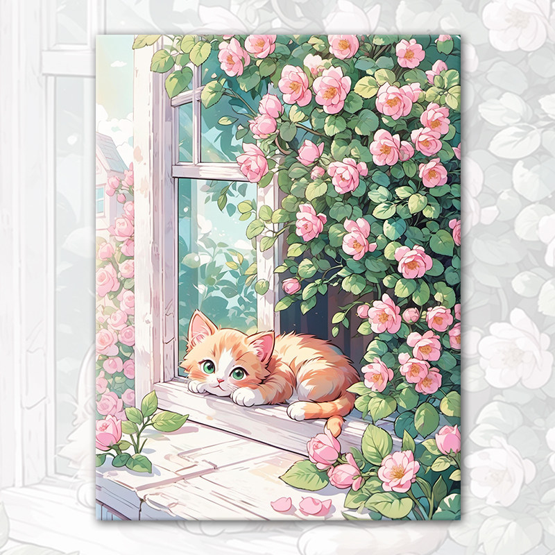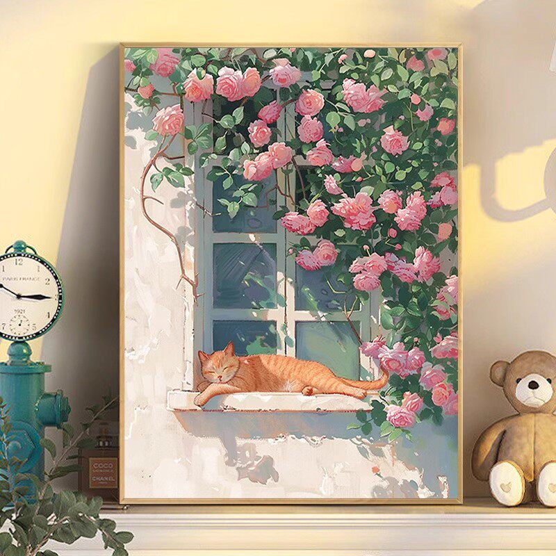窗台猫咪花卉装 饰画成品仿油画风景可爱唯美治愈系卧室客厅摆挂画