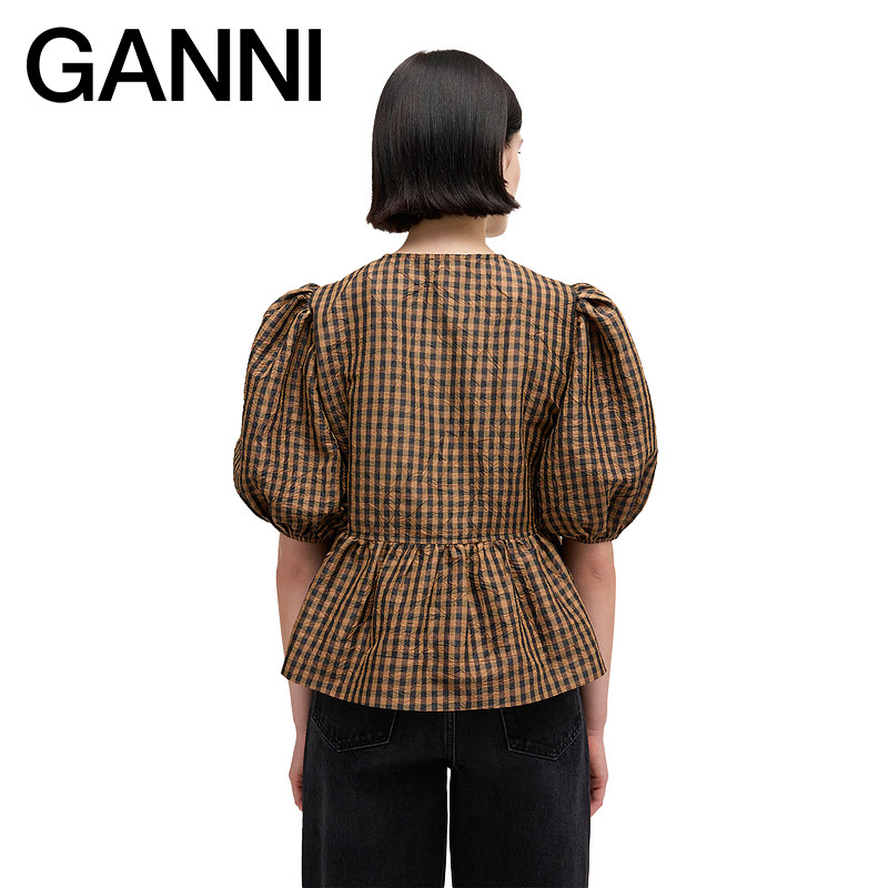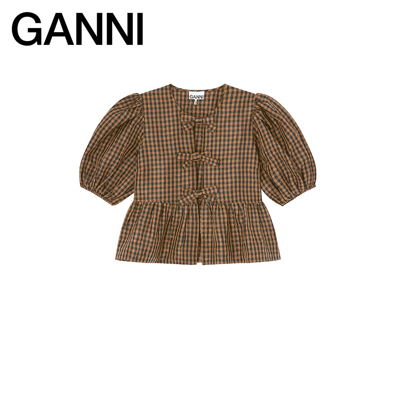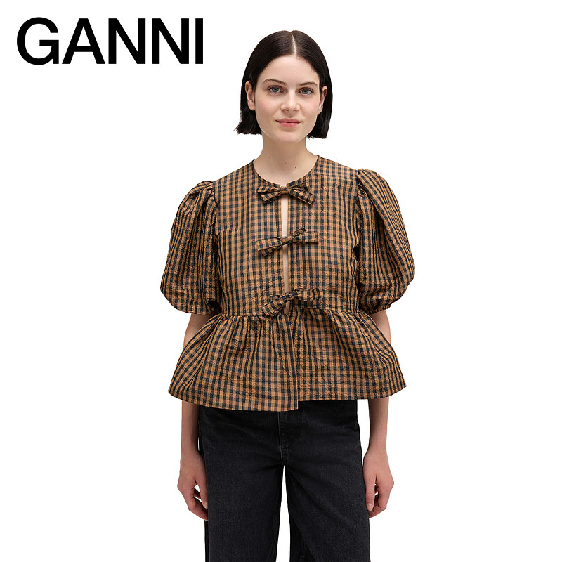 A1040085925 上衣衬衫 GANNI女装 优雅简约复古格纹荷叶边系带半袖