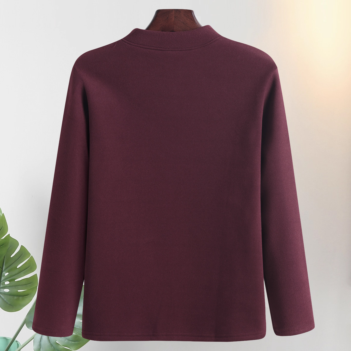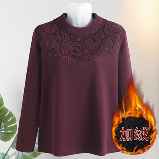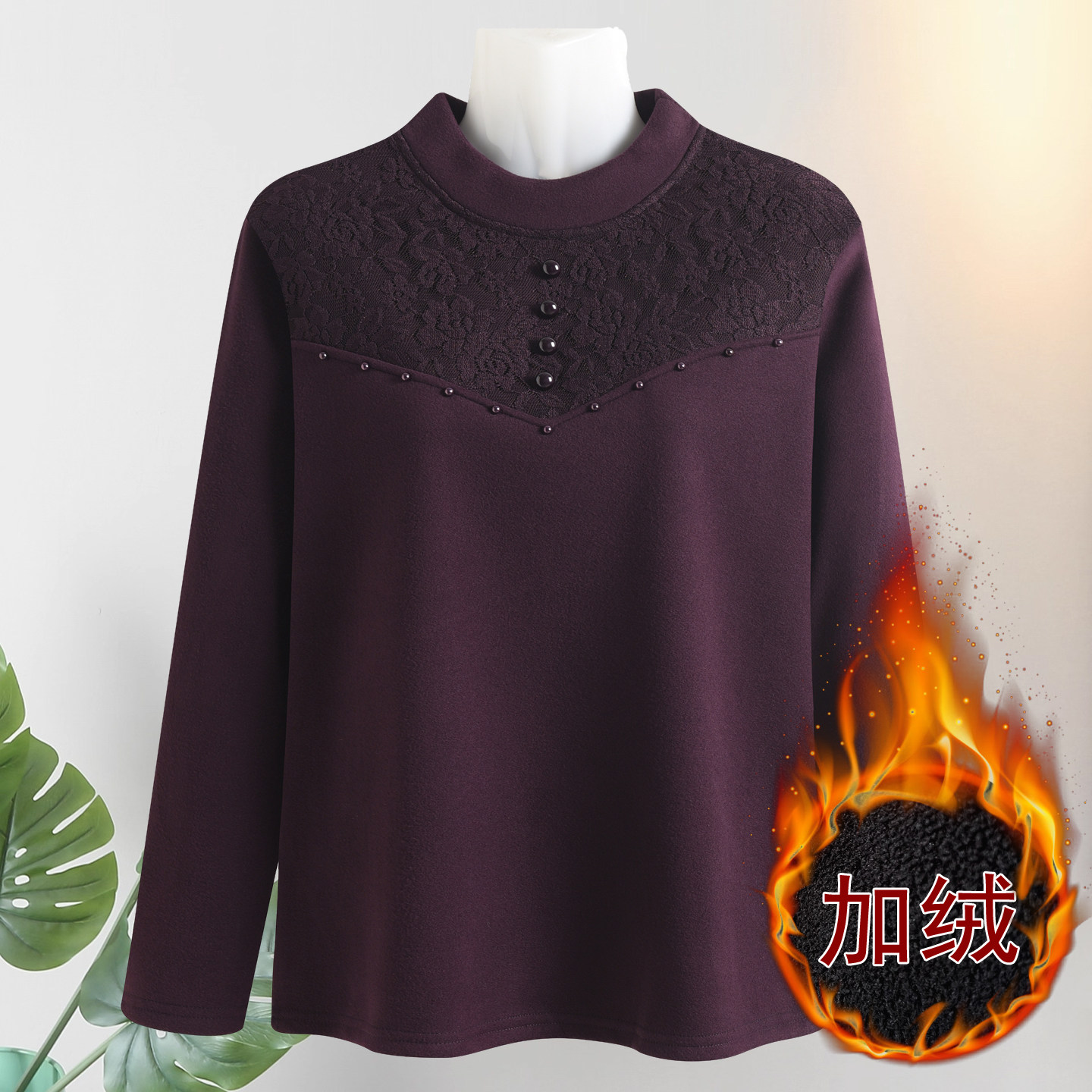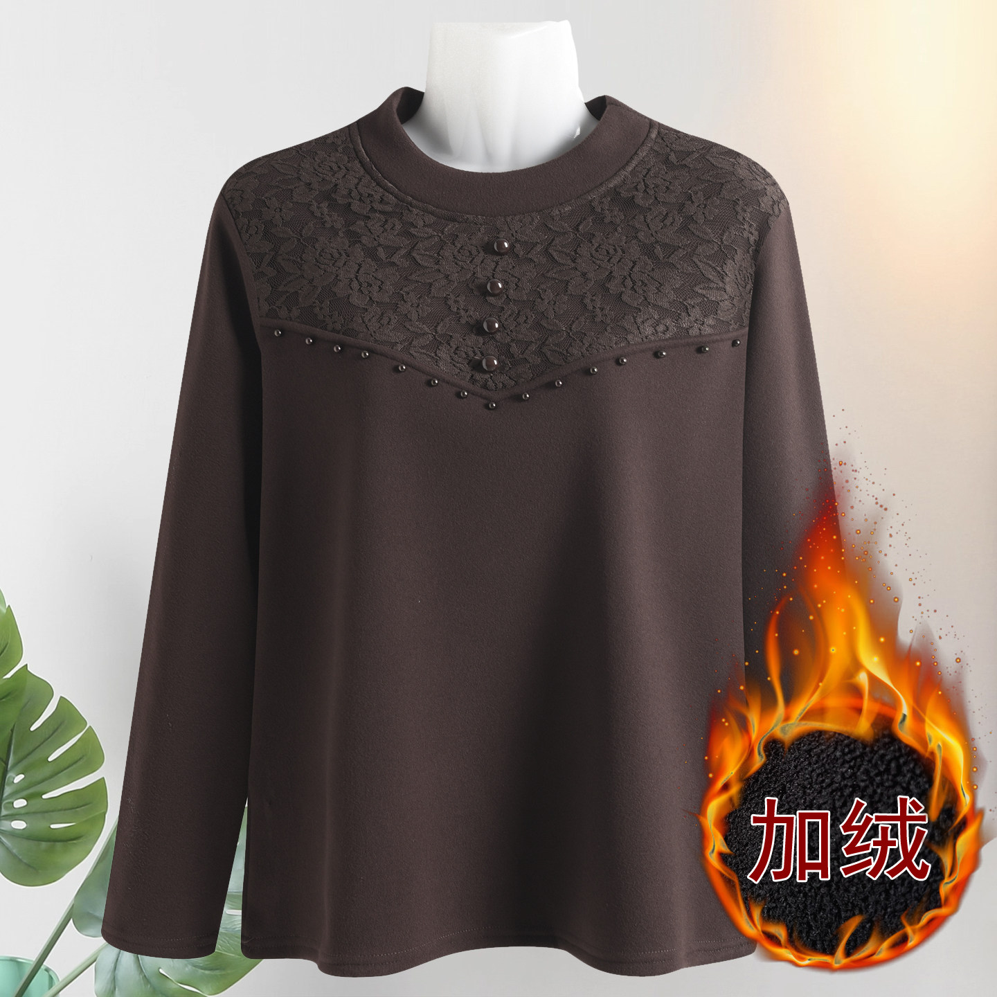 蕾丝拼接圆领百搭显瘦打底衫 妈妈秋冬加绒保暖长袖 上衣中老年女装