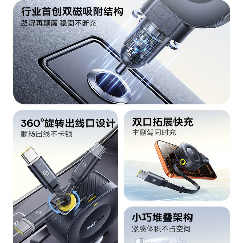倍思 车载充电器伸缩线适用苹果iPhone17Pro三星手机通用车充45W