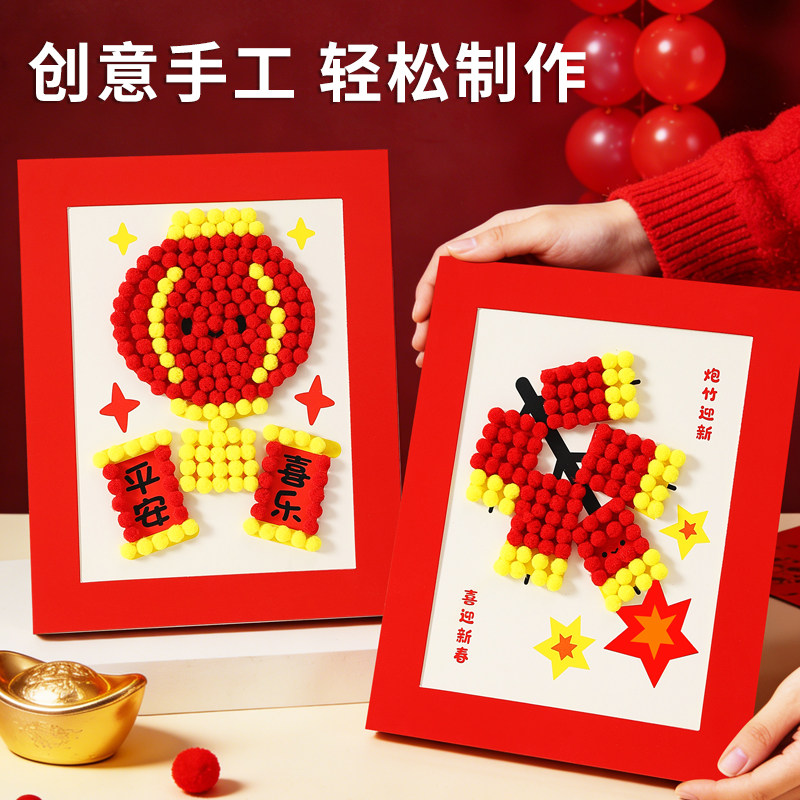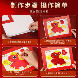 儿童新年手工diy毛球画制作材料春节过马年幼儿园中小班活动作品