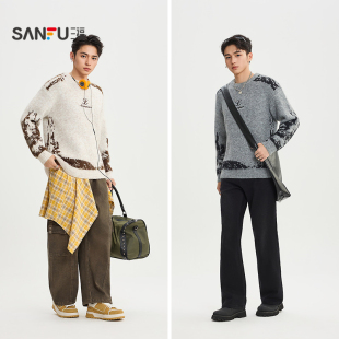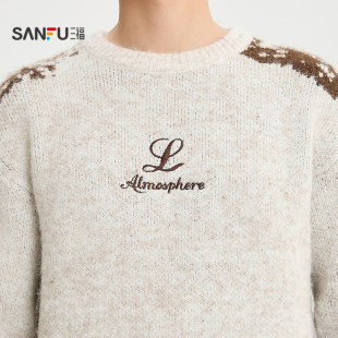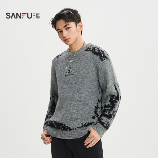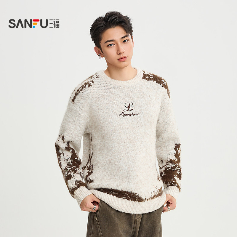 街头潮流圆领上衣513333 英文刺绣马海毛毛衣 三福2025冬季 男士