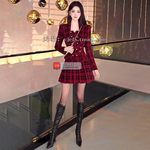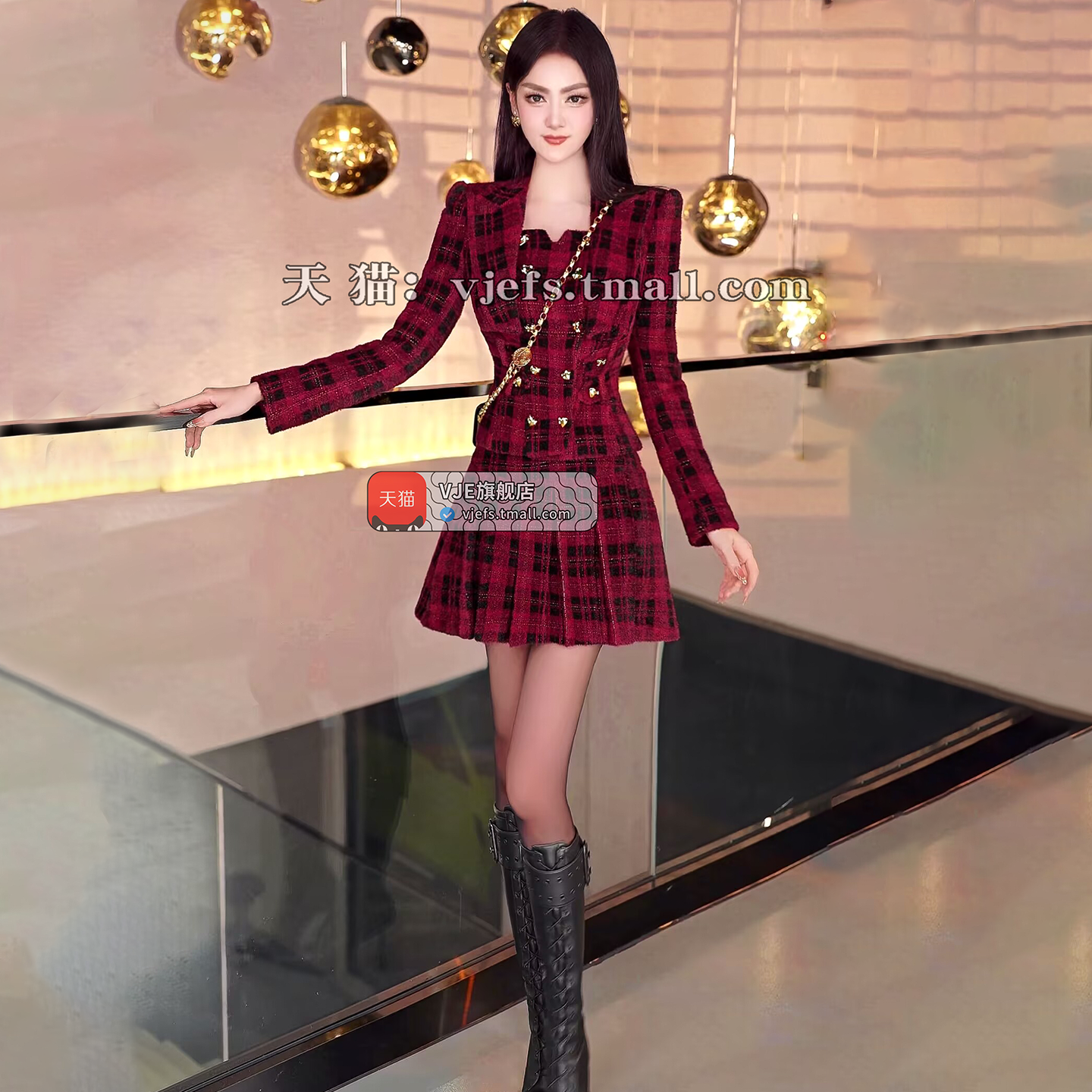 假两件上衣百褶半身裙两件套 2025新款 VJE冬季 欧美格纹职业范套装