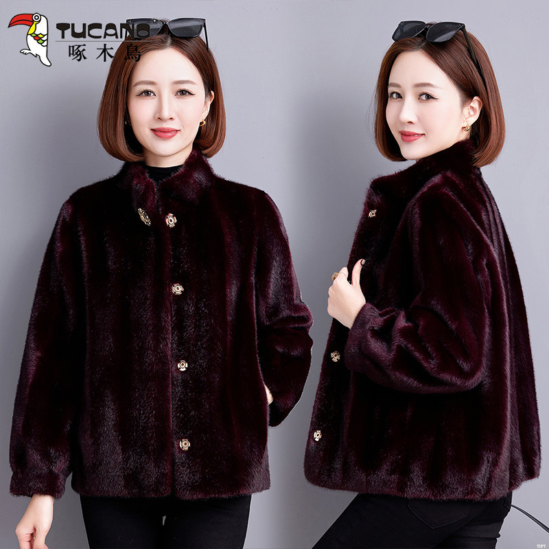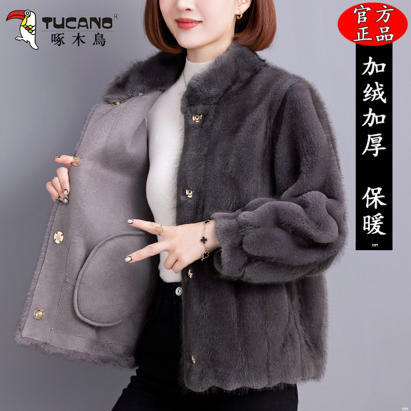 皮毛一体外套宽松加厚保暖立领皮草上衣女 短款 啄木鸟2025冬季 新款