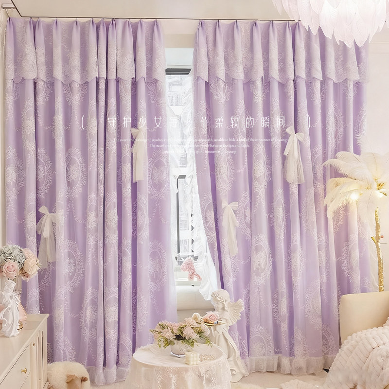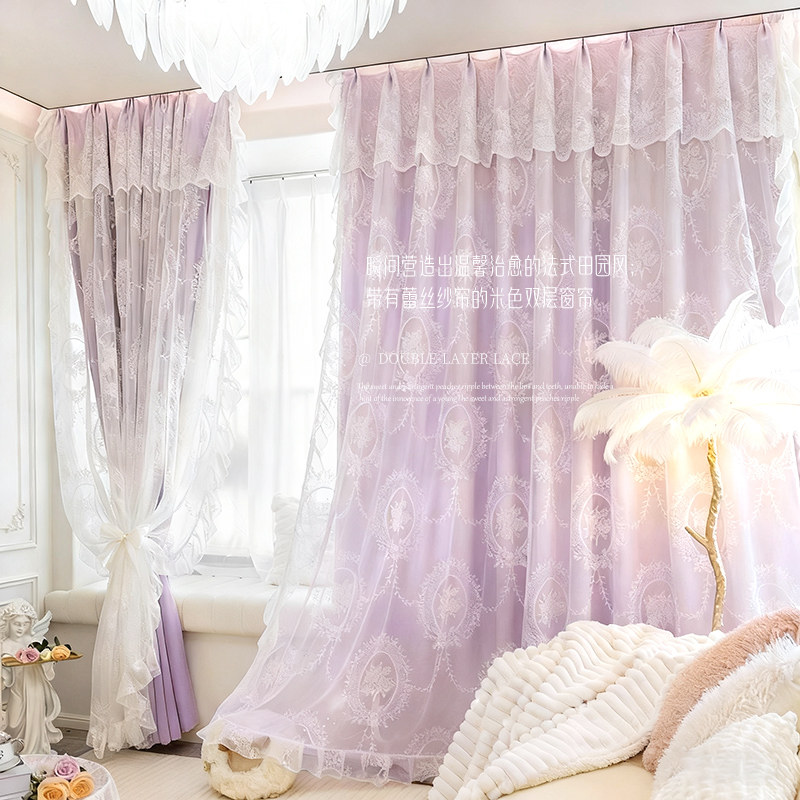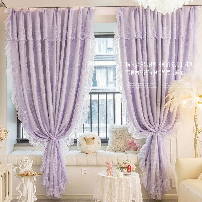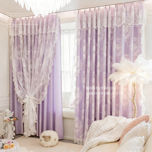 法式 窗帘蕾丝双层一体加厚遮光成品卧室复古风紫色 浪漫高级感新款