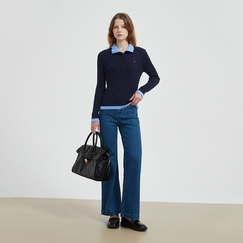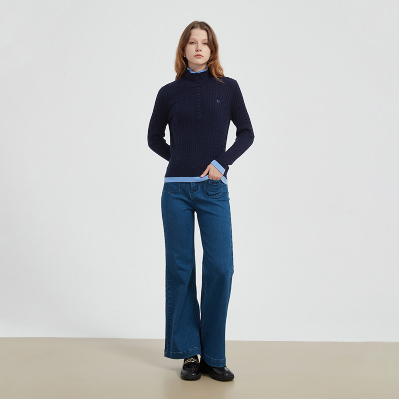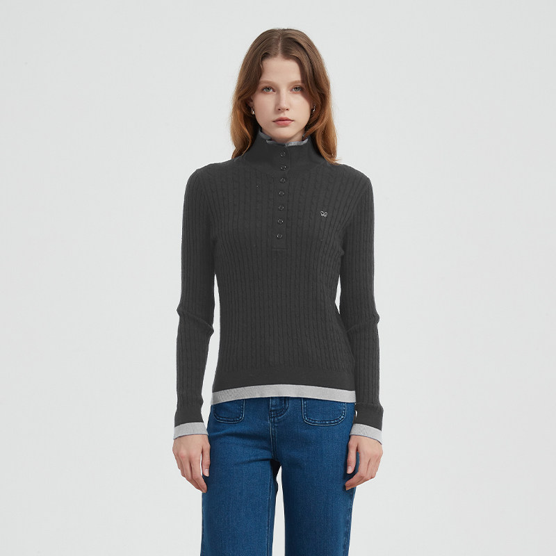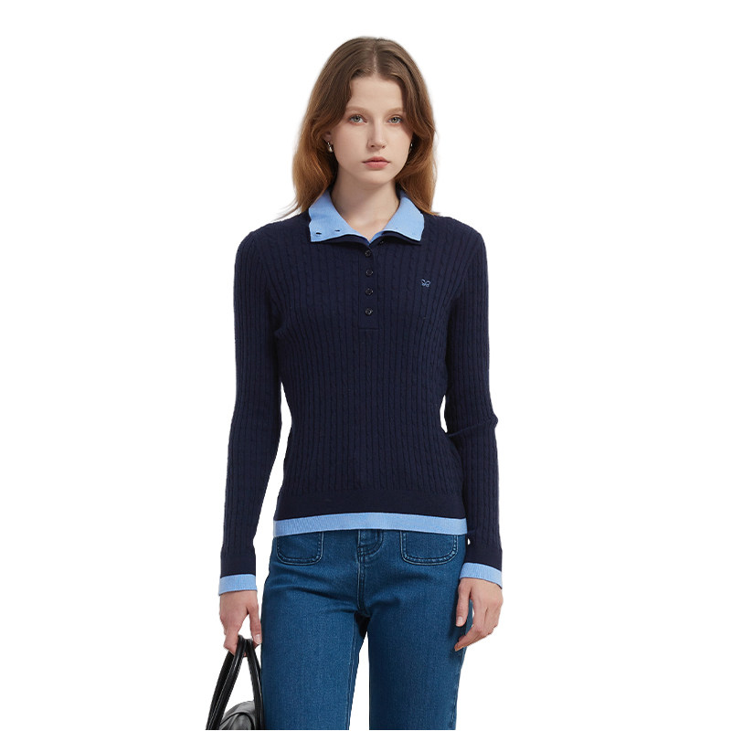 上衣女 高级拼色假两件半开领绞花针织衫 羊毛针织毛衣 Bari Petit